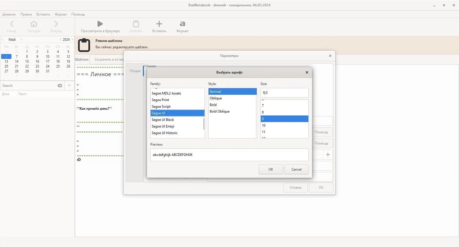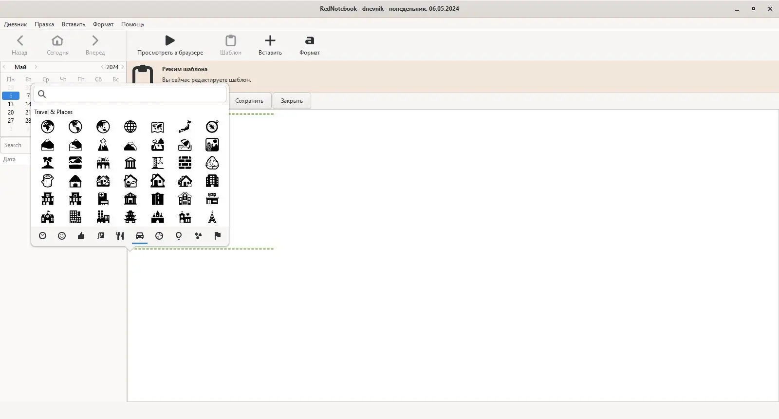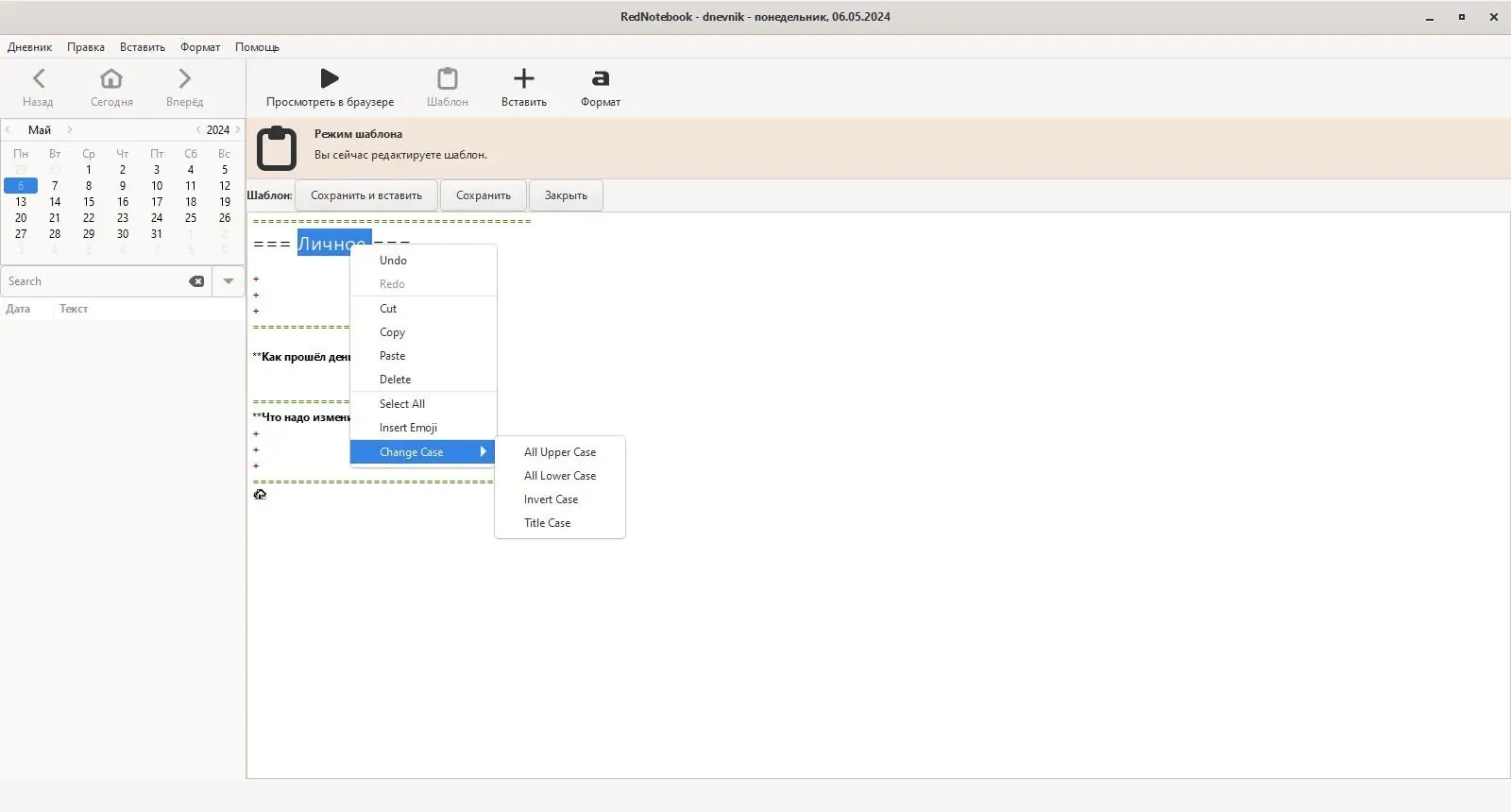 После запуска приложение открывает календарь с возможностью перехода к любой дате. Выбрав день, пользователь может начать ввод текста в основной области, используя базовые функции форматирования: списки, заголовки, цитаты и выделение. Для ускорения ввода можно применять заранее заданные шаблоны, которые автоматически вставляются в зависимости от дня недели или ручного вызова.