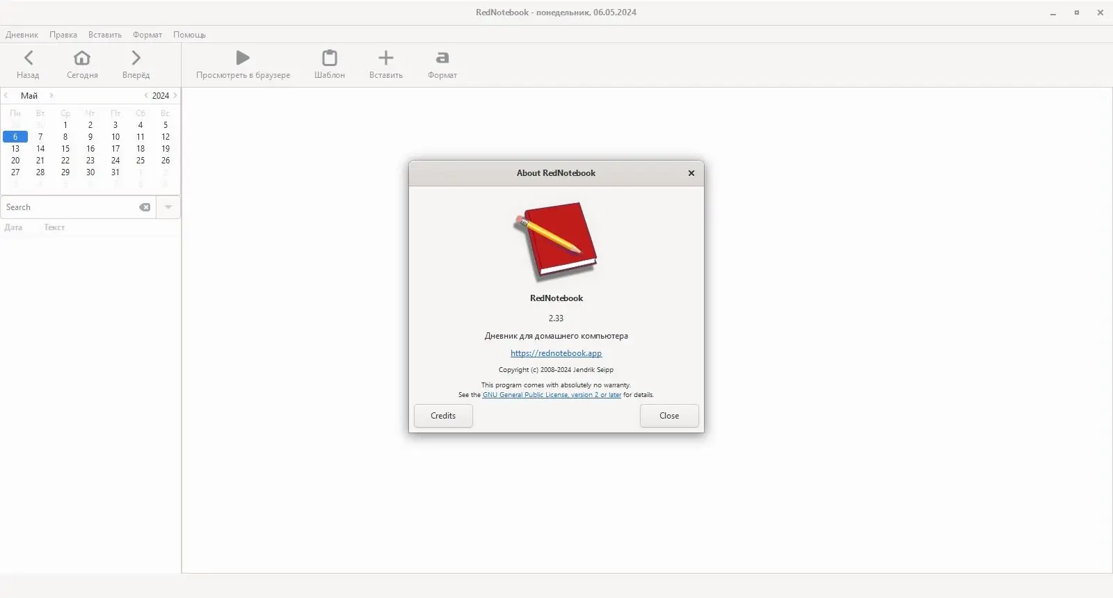 RedNotebook — это минималистичный электронный дневник с интуитивным интерфейсом, созданный для ведения личных записей, фиксации идей и планирования повседневных задач. Программа работает на базе Python и GTK+, обеспечивая стабильность в средах Gnome и других окружениях рабочего стола. Благодаря встроенным инструментам поиска, шаблонам и поддержке экспорта, ведение заметок становится простым и систематизированным процессом.