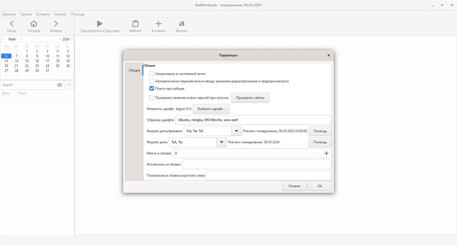 RedNotebook помогает не только записывать мысли, но и визуализировать свои интересы через облако тегов.