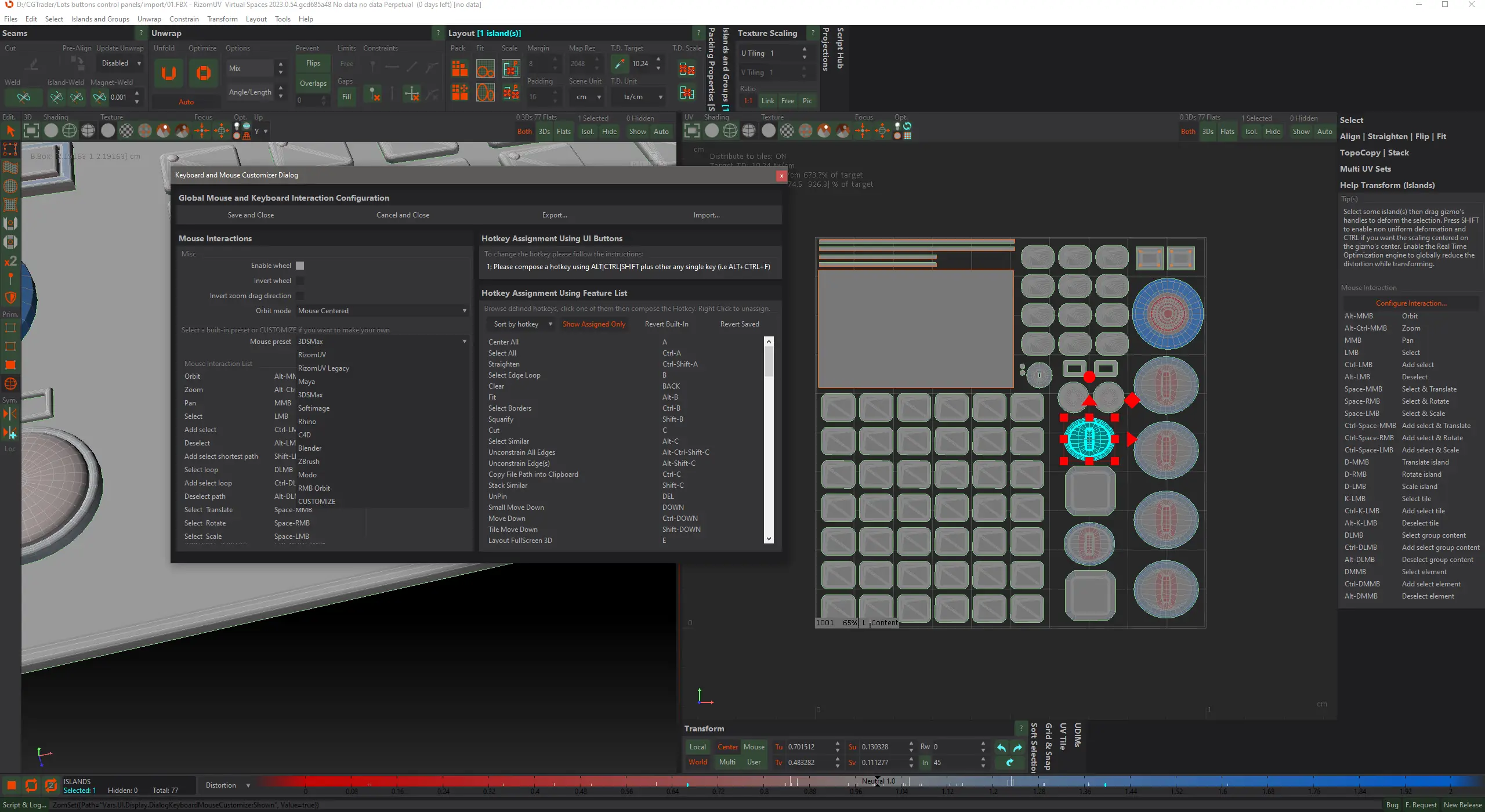 Работа с RizomUV начинается с импорта 3D-модели, поддерживается множество форматов, включая OBJ, FBX и теперь — Pixar USD. После загрузки сетки пользователь может использовать Magic Wand для быстрого выделения полигонов с новым режимом Auto-Unfold. Далее применяются инструменты разрезания, развёртки и упаковки, которые работают в реальном времени. Уникальная функция «Unfold along U and V» позволяет контролировать направление разворачивания, обеспечивая предсказуемый результат. Для повторяющихся действий доступна команда «Повторить последнее», ускоряющая серийные операции. Настройки мыши и интерфейса кастомизируются под индивидуальные предпочтения, а обновлённый GUI делает навигацию более удобной. Экспорт финальных UV-карт поддерживает PNG с прозрачным фоном, что удобно для последующей обработки в текстурных редакторах.
