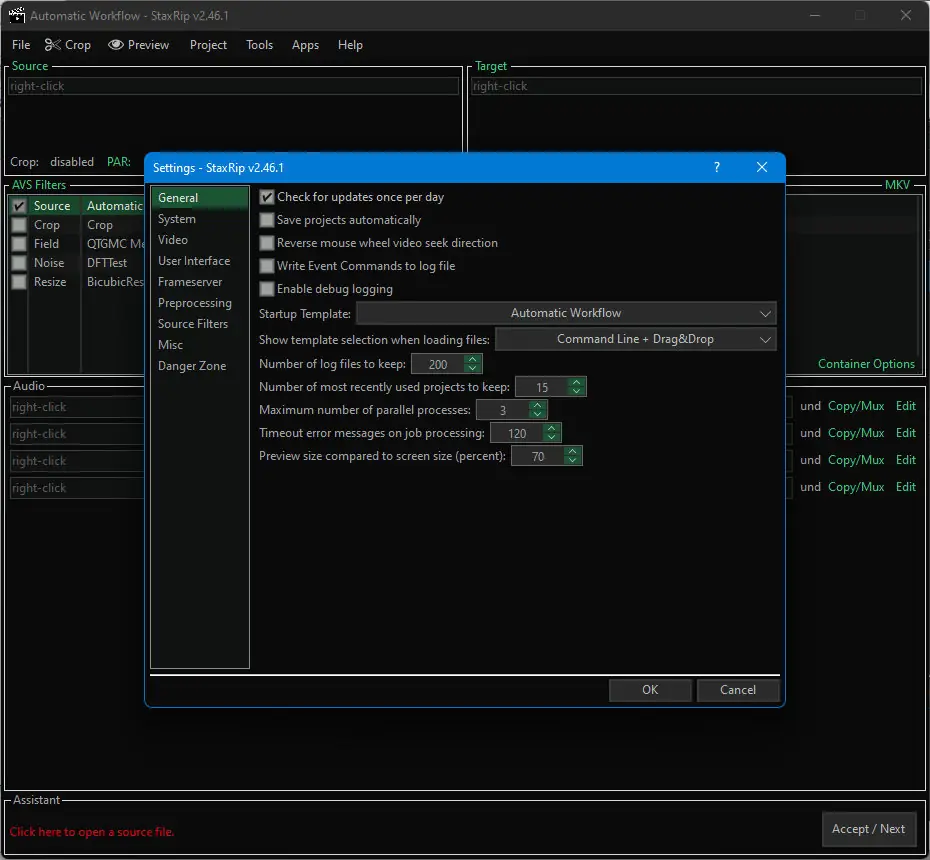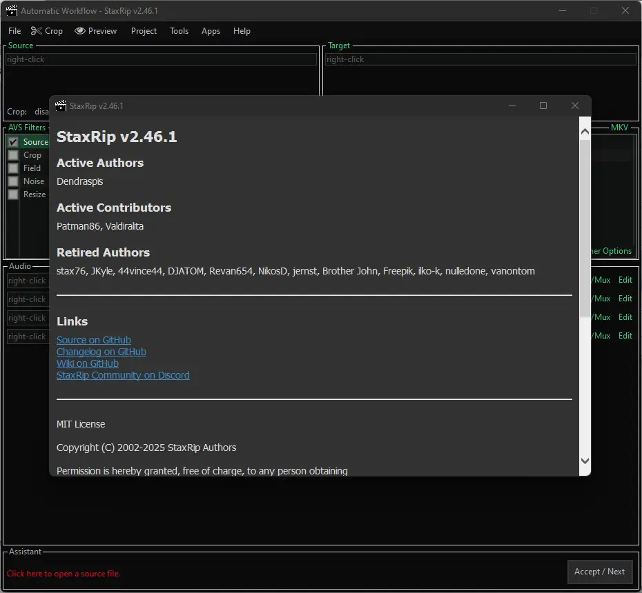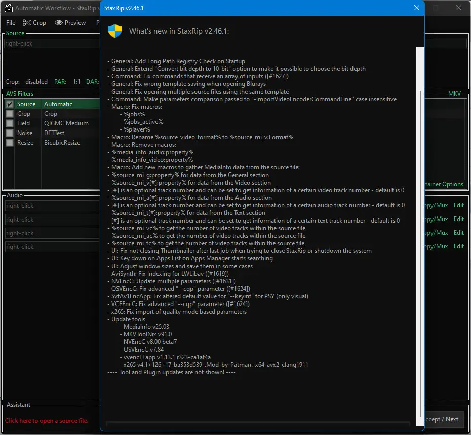 StaxRip — это мощный инструмент для кодирования видео, объединяющий в себе функции конвертера, редактора и пакетного обработчика, ориентированный на высокое качество преобразования медиафайлов. Программа поддерживает широкий спектр форматов, включая H.265, H.264, VP9 и другие, а также интегрирует аппаратное ускорение от AMD, Intel и NVIDIA. Подходит как для новичков, так и для опытных пользователей, работающих с Blu-ray, DVD и цифровыми источниками.