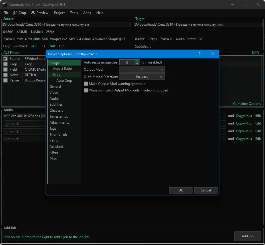 StaxRip представляет собой универсальное решение для перекодирования видео с минимальным ухудшением качества и максимальным контролем над процессом. Программа позволяет конвертировать контент из Blu-ray, DVD, DVB и других источников в популярные форматы, такие как MP4, MKV, AVI и WEBM, с использованием современных кодеков, включая x264, x265 и VP9. Поддержка аудиоформатов охватывает MP3, AAC, DTS, AC3 и WAV, что делает возможным сохранение многоканального звука при рипе дисков.