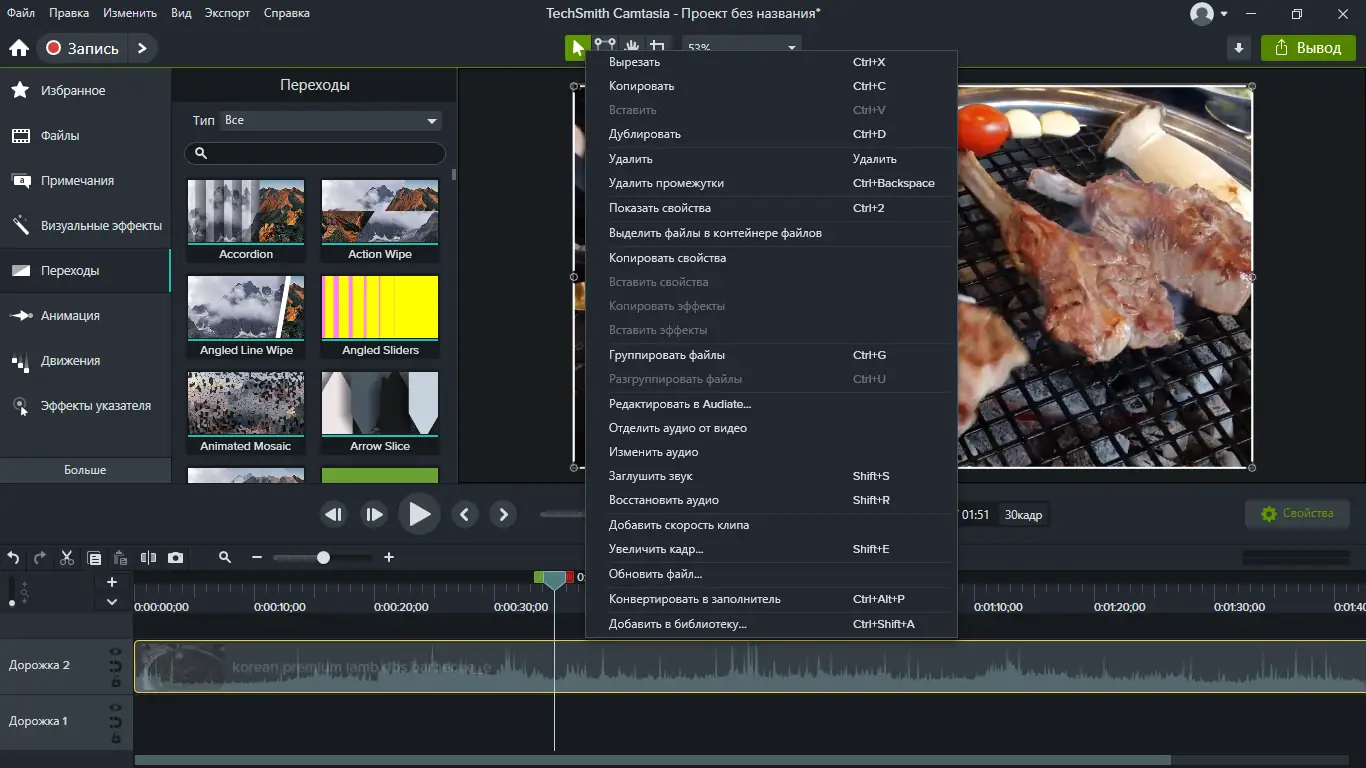 - Работа с аудио: запись голоса, подавление шумов, регулировка громкости и синхронизация дорожек