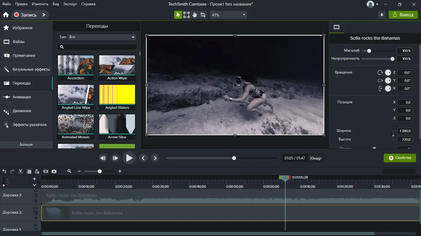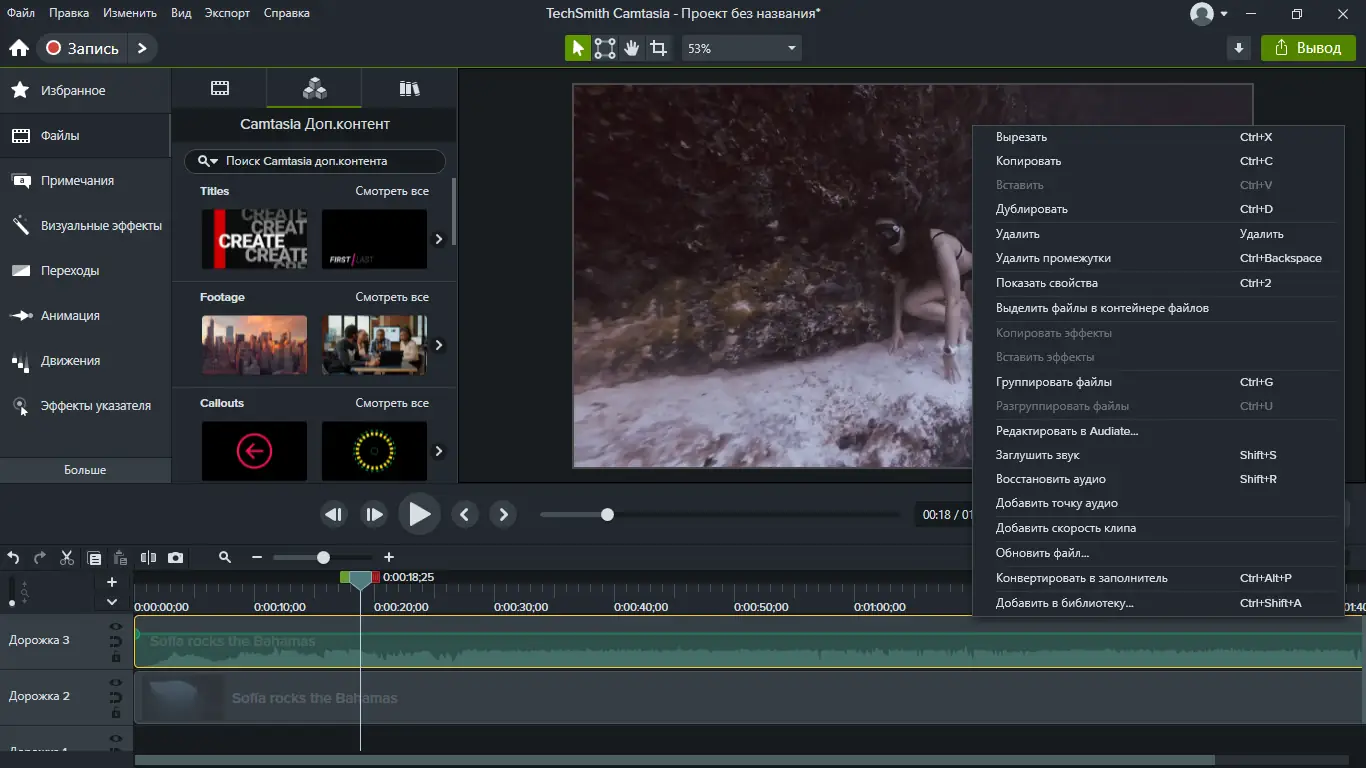 Camtasia отличается высокой производительностью и стабильной работой даже при обработке длительных видео. Интерфейс интуитивно понятен, а встроенная библиотека медиаэлементов ускоряет процесс монтажа. Программа поддерживает работу с несколькими дорожками видео и аудио, что позволяет создавать сложные композиции без использования сторонних редакторов. Кроме того, реализована возможность предварительного просмотра в реальном времени, что упрощает точную настройку эффектов.