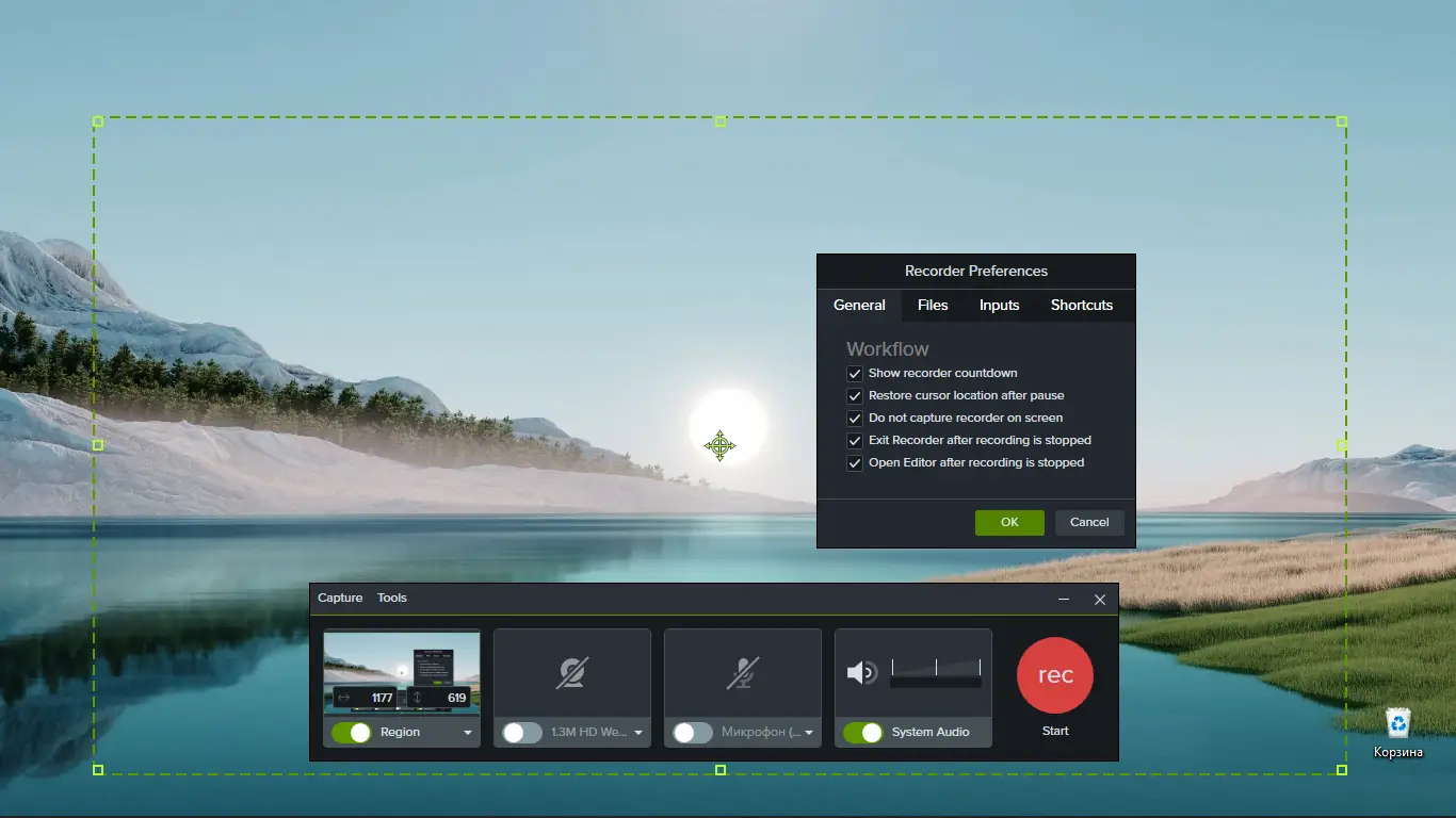 - Гибкие настройки захвата экрана: выбор области, частоты кадров, аудиодорожек.