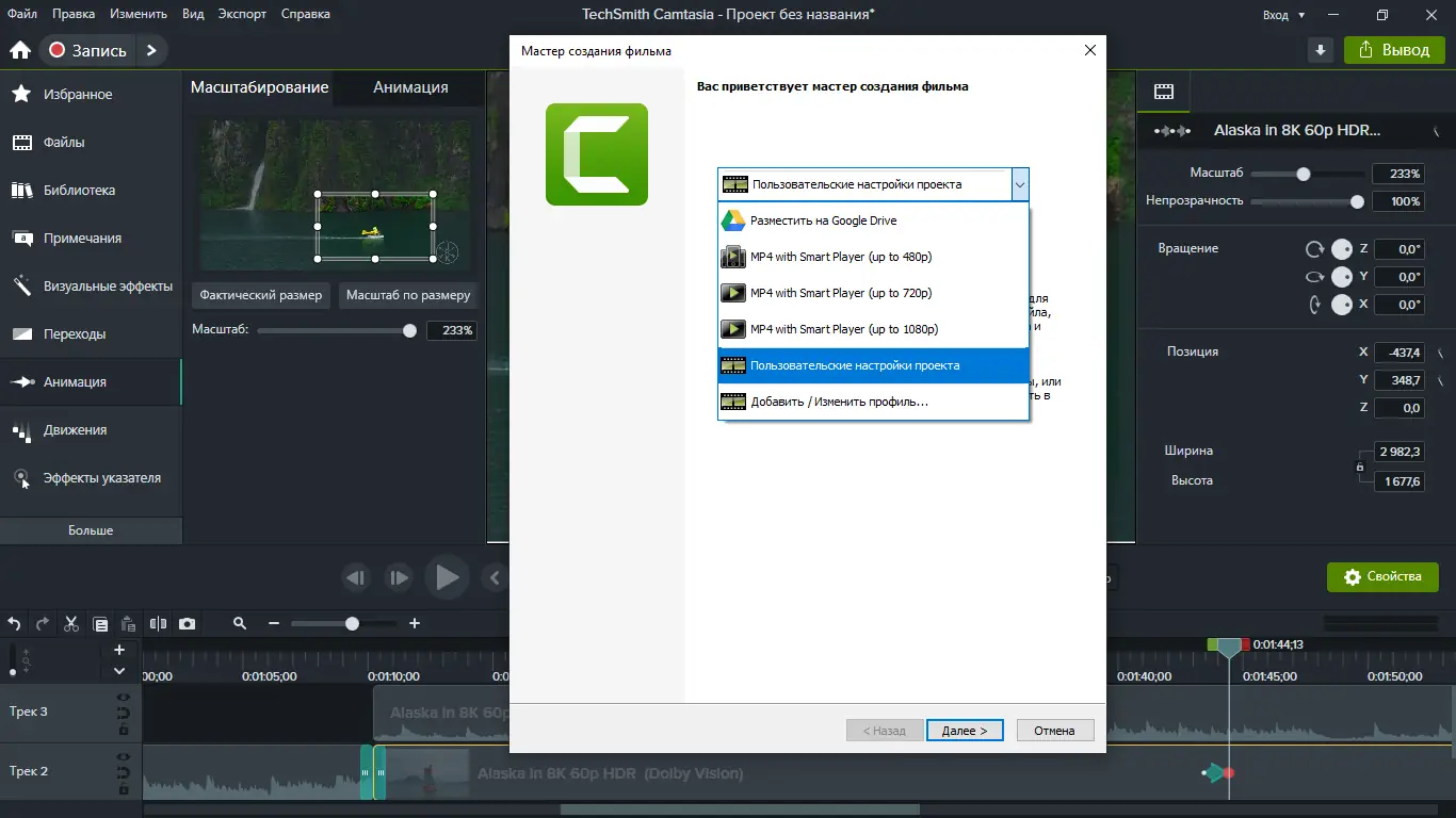 Работа с TechSmith Camtasia начинается с выбора источника записи: можно захватывать весь экран, отдельное окно или заданную область. Перед началом записи настраиваются параметры аудио, включая микрофон, системный звук и веб-камеру. После завершения записи фрагмент автоматически импортируется в редактор, где доступны инструменты для обрезки, наложения переходов, добавления текста, звуковых дорожек и визуальных акцентов. Режим наложения позволяет комбинировать несколько видео слоёв, а редактирование траектории курсора помогает выделить важные действия пользователя.