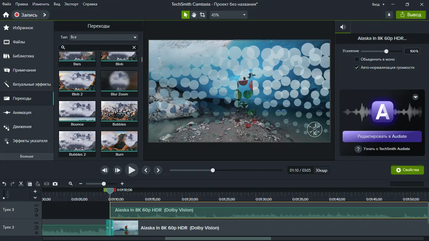 TechSmith Camtasia предоставляет полный цикл работы с видео: от записи экрана до финального экспорта в нужный формат. Пользователь может фиксировать действия на рабочем столе, синхронизировать запись с веб-камерой и микрофоном, а также включать системные звуки. Программа поддерживает высокую точность захвата, включая возможность записи отдельных окон, полноэкранного режима или конкретной области экрана, что делает её идеальной для создания уроков, инструкций и обзоров программного обеспечения.