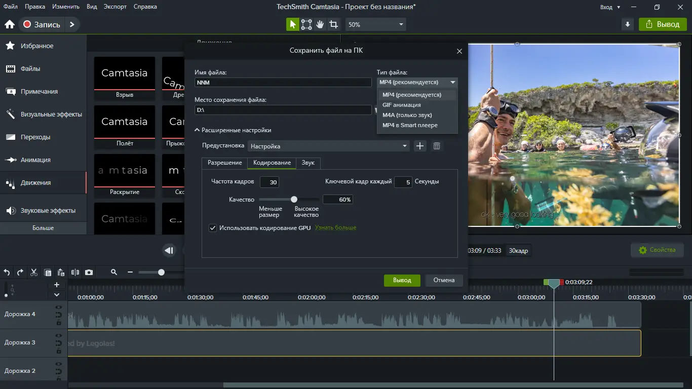 Программа TechSmith Camtasia предоставляет комплексное решение для создания профессионального видео без необходимости использования нескольких отдельных приложений. Она позволяет точно фиксировать всё, что происходит на мониторе, включая действия пользователя, звук с микрофона, системные аудиопотоки и изображение с веб-камеры. Запись осуществляется в высоком разрешении с минимальной задержкой, что особенно важно при создании обучающих курсов или демонстраций программного обеспечения. Результат сохраняется в популярных форматах, таких как MP4, AVI, WMV, MOV, а также в специализированных — SWF, FLV, GIF и собственном CAMV.