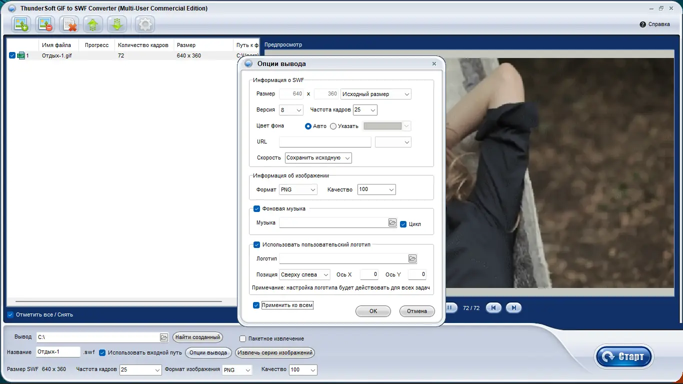 - Функция преобразования GIF в SWF с сохранением прозрачности, возможностью добавления музыки и выбором версии Flash.