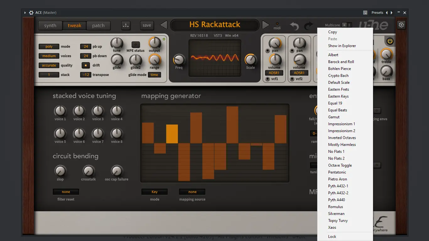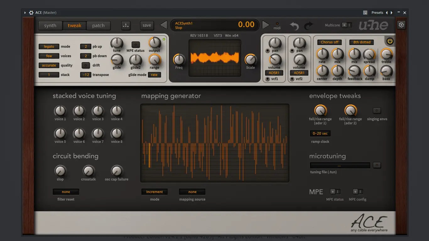 uhe — ace представляет собой виртуальный аналоговый синтезатор, разработанный с акцентом на гибкость и наглядность. Его полумодульная структура позволяет пользователям свободно соединять компоненты, такие как осцилляторы, фильтры, огибающие и LFO, без необходимости в глубоких знаниях синтеза. Интерфейс интуитивно понятен, но при этом предоставляет доступ к тонкой настройке параметров, что ценно как для новичков, так и для профессионалов.