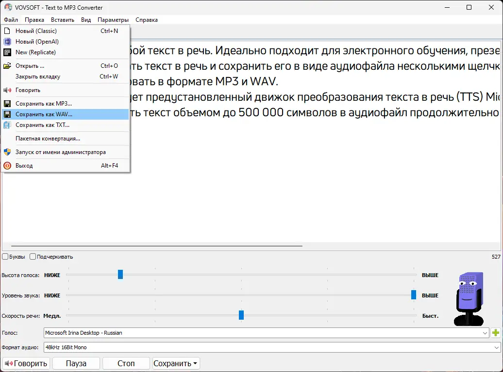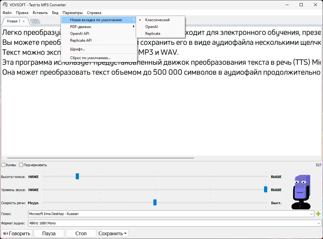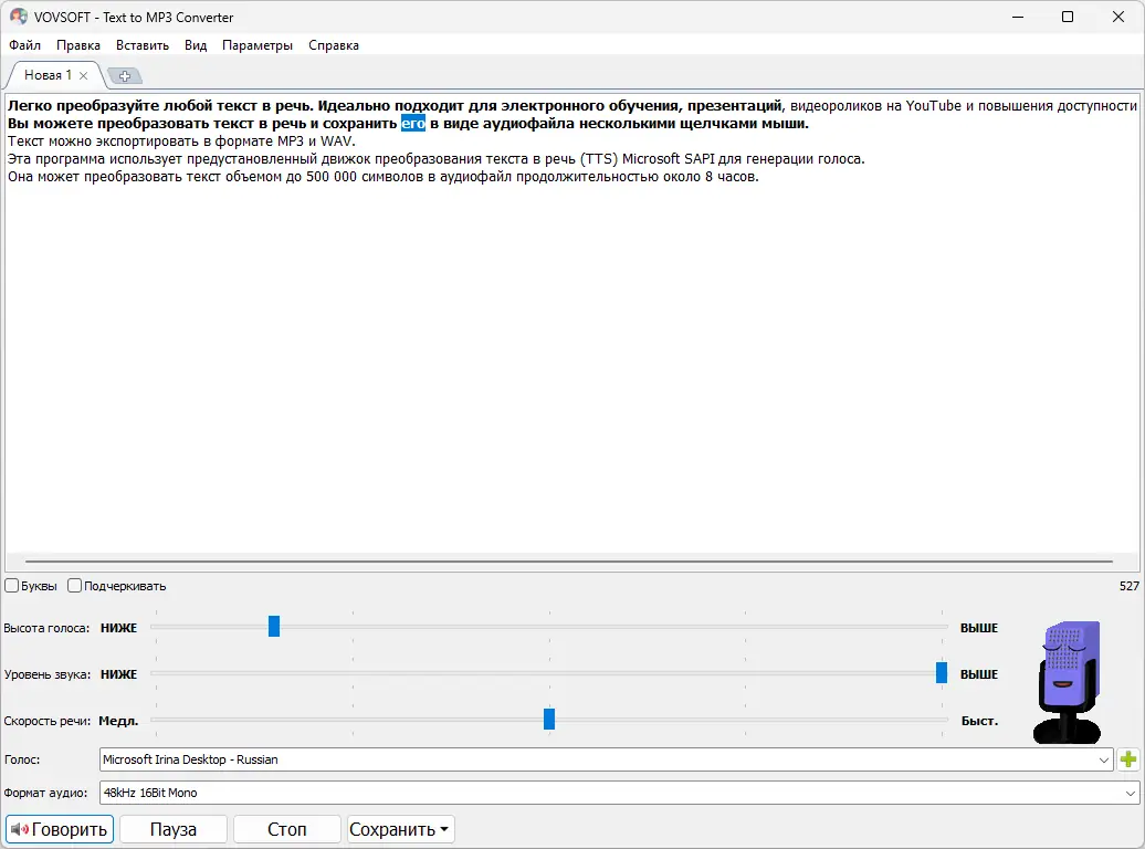 - Поддержка преобразования текст в MP3 и текст в WAV