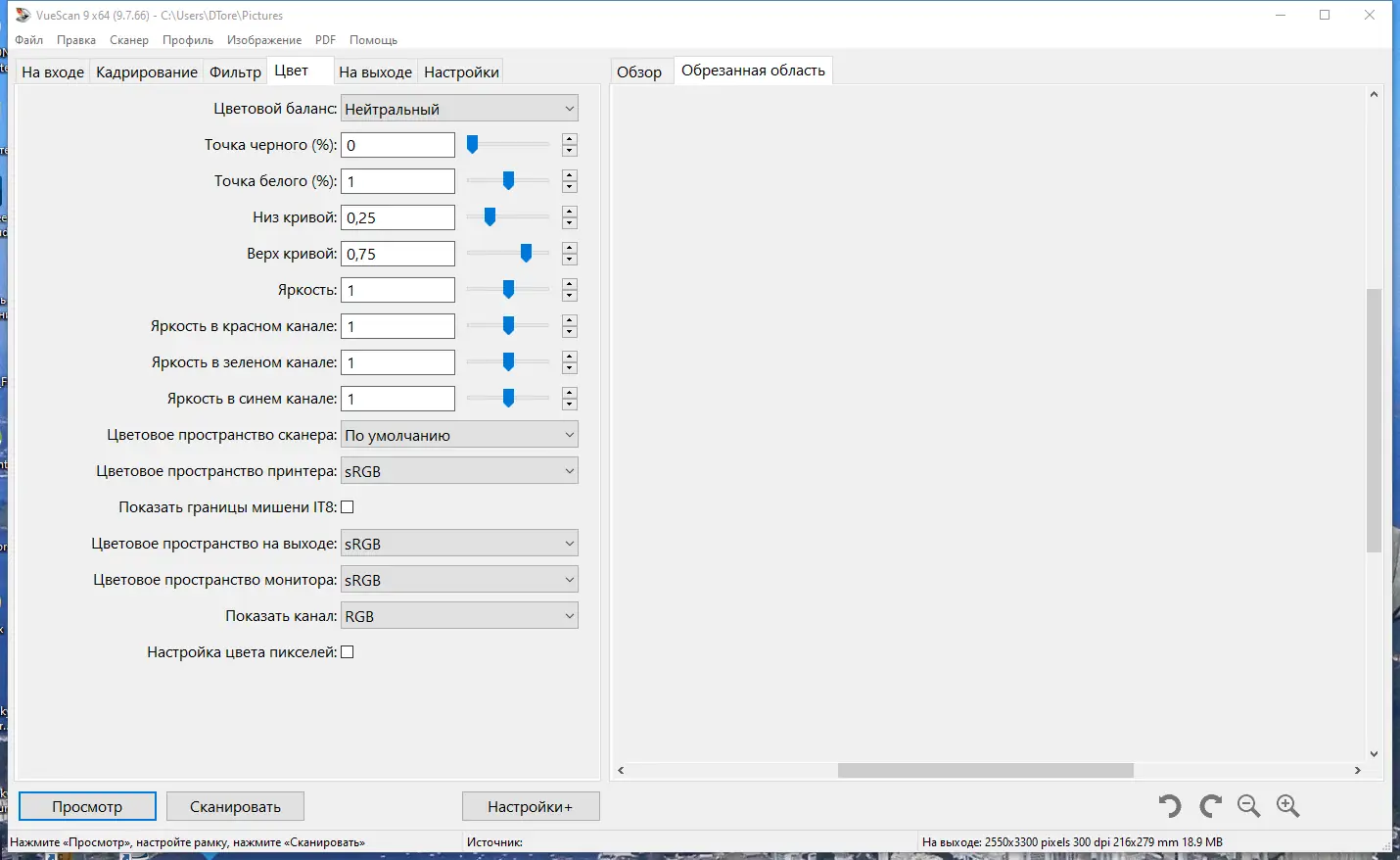 Интерфейс VueScan интуитивно понятен: после подключения сканера программа автоматически определяет устройство и предлагает базовые настройки. Пользователь может выбрать тип оригинала — от документа до цветного негатива, указать нужное разрешение, глубину цвета и формат вывода. Доступна ручная регулировка экспозиции, баланса белого, динамического диапазона и градационной кривой. Для серийного сканирования используется пакетный режим, а для повышения качества — многопроходное сканирование с усреднением. Сохранённые профили настроек позволяют быстро переключаться между типами задач.