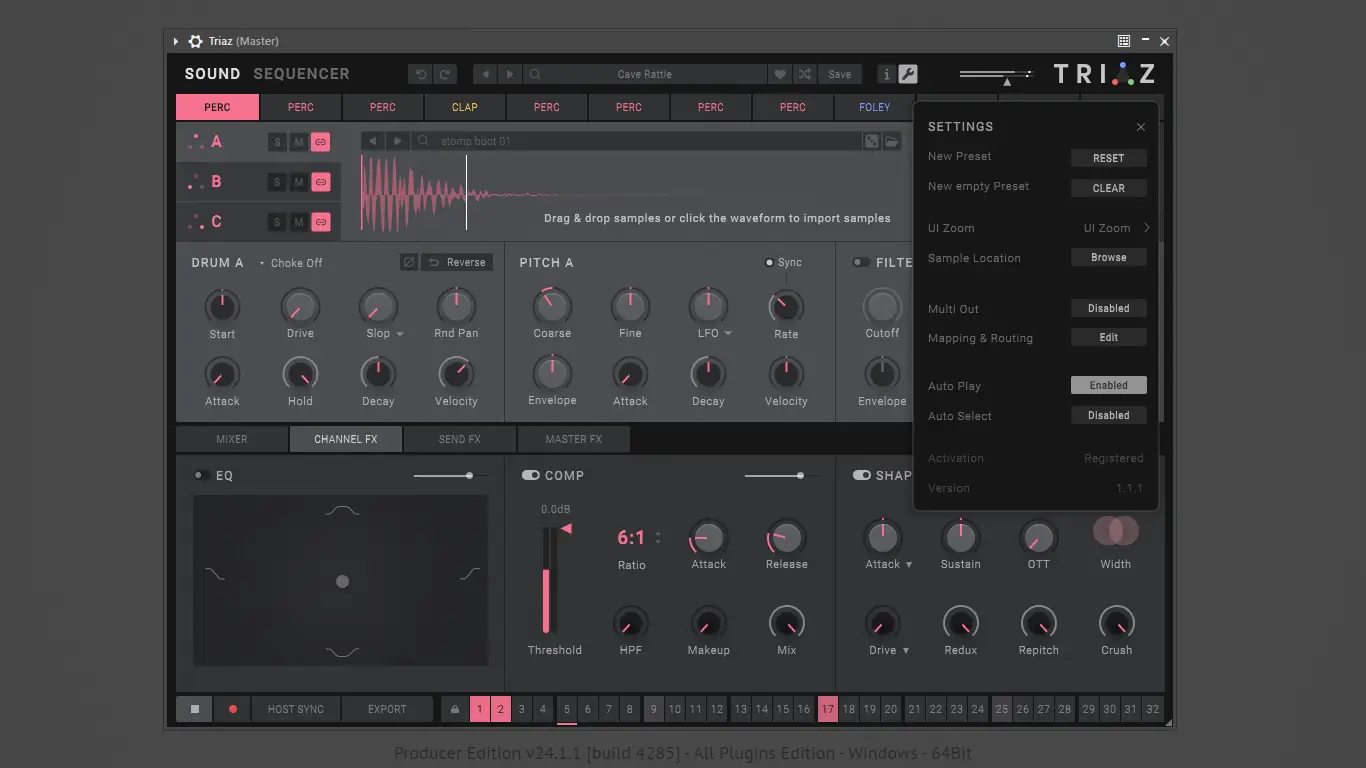 Работа с Triaz начинается с загрузки плагина в DAW, после чего доступен полный контроль над звуковым движком. Пользователь может выбрать один из встроенных пресетов или создать собственный комплект, импортировав сэмплы через систему drag-and-drop. Встроенный браузер позволяет быстро фильтровать сэмплы по категории, жанру или темпу, а функция автоматической маркировки ускоряет организацию контента. Каждый пэд настраивается независимо: можно регулировать громкость, тюнинг, фильтрацию, применять эффекты и задавать модуляцию через Motion Sequencer. Для экспериментов доступен Drum Randomizer, который генерирует новые комбинации сэмплов с сохранением ритмической структуры.