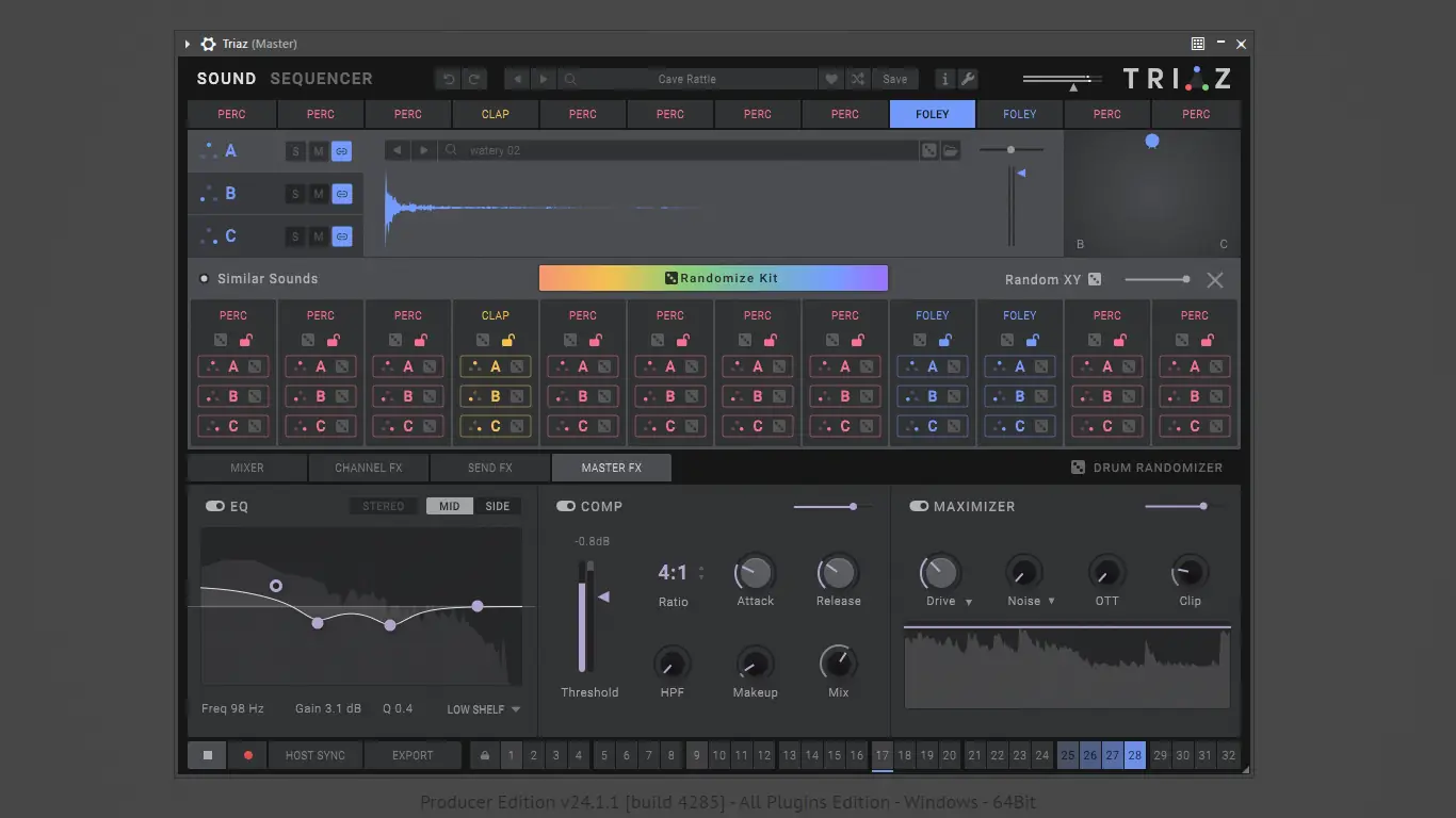 Wave Alchemy — Triaz — это передовой драм-движок, созданный для продюсеров, стремящихся к инновациям в создании ударных. Сочетая полиритмию, многослойное наложение сэмплов и динамическое микширование, инструмент открывает новые горизонты в звуковом дизайне. Более700 пресетов и15000 сэмплов обеспечивают мгновенный доступ к разнообразным жанрам, от лоу-фай хип-хопа до техно и драм-н-бейса. Программа поддерживает глубокую модуляцию, случайную генерацию ритмов и интуитивное управление, делая процесс создания битов быстрым и вдохновляющим. Triaz интегрируется в любой DAW и предлагает расширенные функции экспорта через MIDI и аудио.