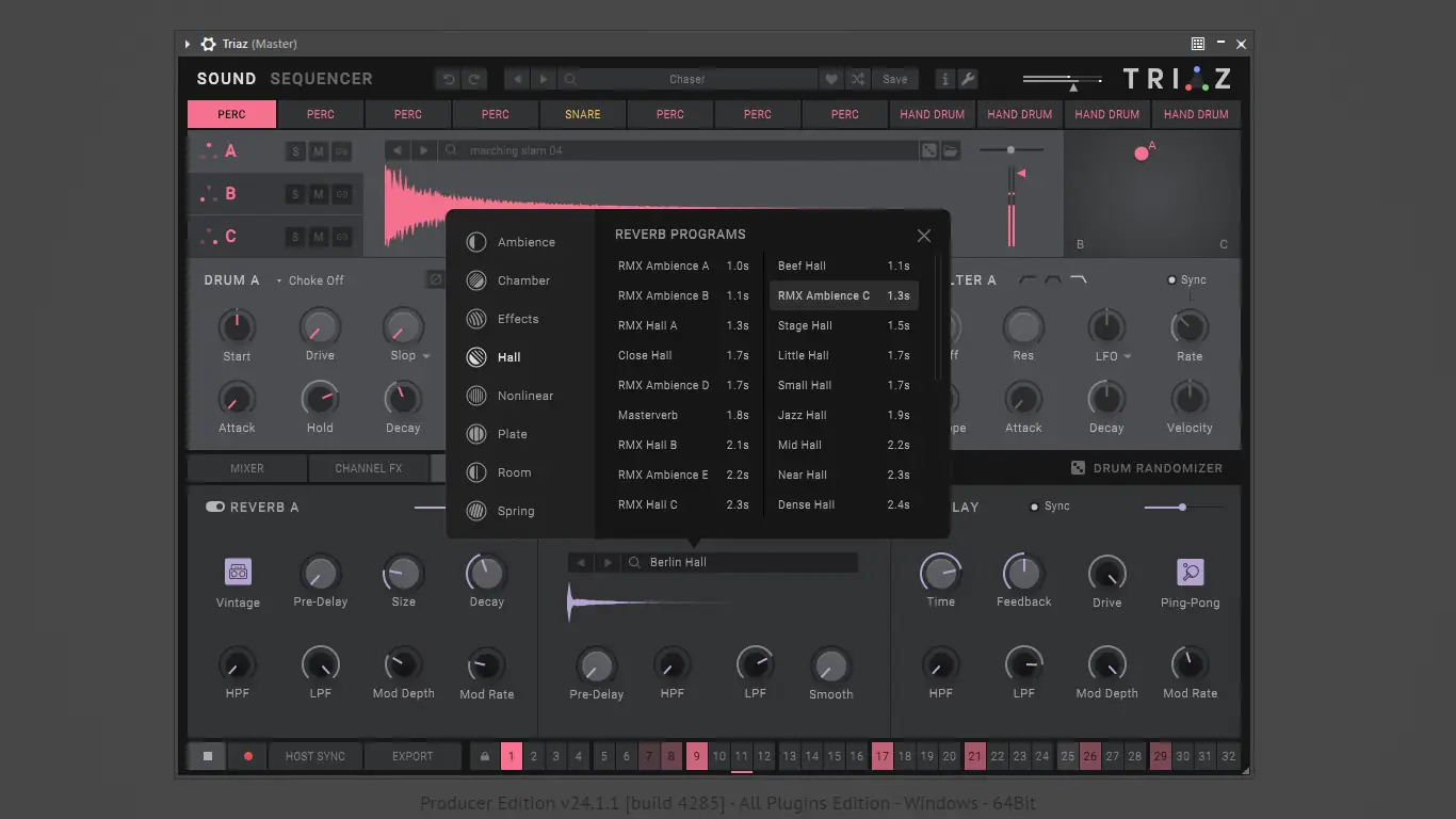 Wave Alchemy — Triaz представляет собой комплексное решение для создания профессиональных ударных, сочетающее мощь современного секвенсора с гибкостью звукового дизайна. Архитектура движка построена вокруг концепции пошаговой модуляции, позволяя настраивать параметры звука в каждом шаге последовательности. Это дает возможность создавать живые, динамичные ритмы, которые развиваются со временем, избегая статичности типичных ударных паттернов. Программа поддерживает полиритмию, что позволяет одновременно запускать несколько ритмических сеток с разными временнЫми делениями, расширяя творческие возможности.