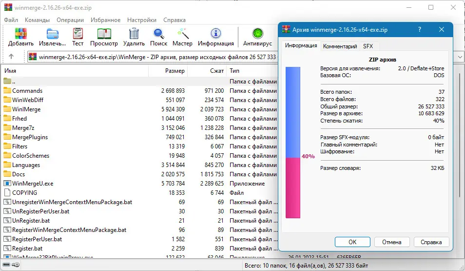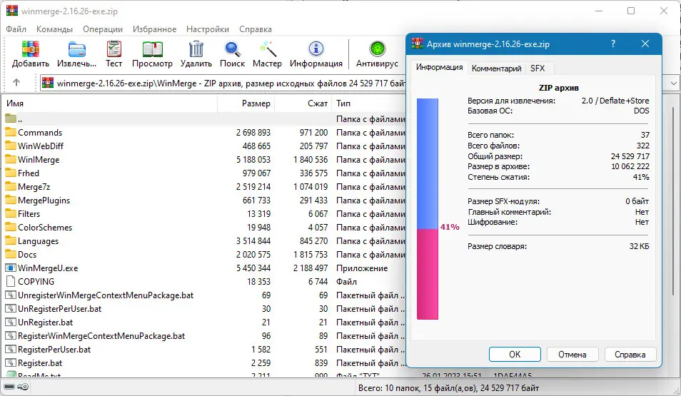 - Интеграция с 7-Zip обеспечивает сравнение содержимого архивов.