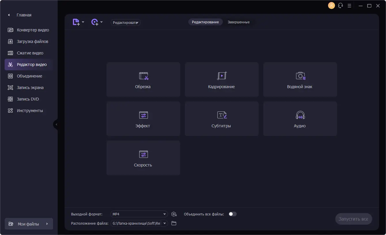 - Инструменты для редактирования: обрезка, объединение, настройка цветокоррекции, добавление водяных знаков и субтитров.