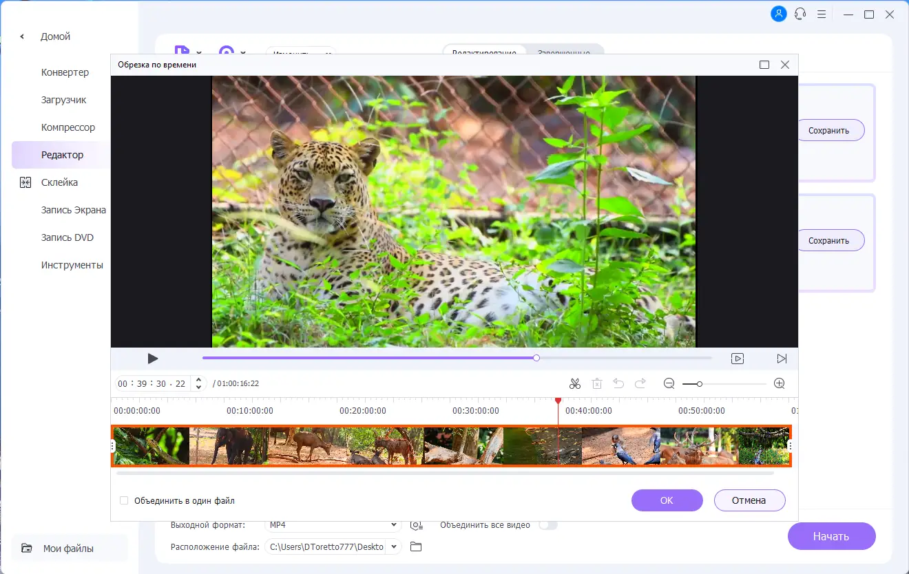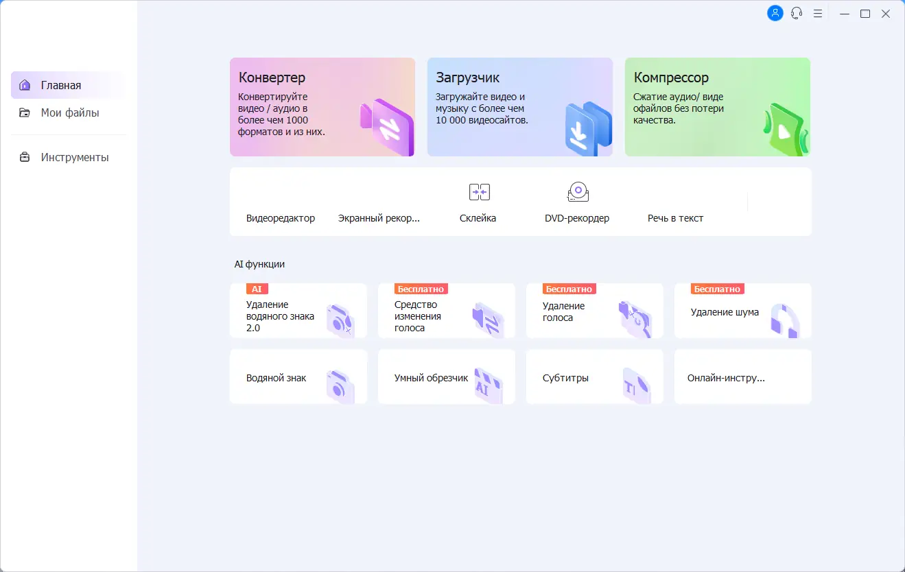 - Встроенные инструменты для редактирования: обрезка, объединение, настройка цвета, добавление водяных знаков и субтитров.