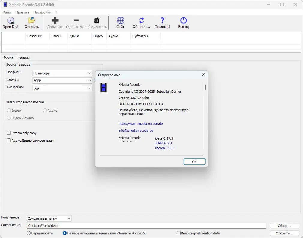 XMedia Recode — это мощный инструмент для конвертации видеофайлов, совместимый с широким спектром устройств, включая мобильные телефоны, плееры, портативные носители и игровые приставки. Программа поддерживает множество форматов, позволяет редактировать видео и настраивать параметры кодирования. Интерфейс прост в освоении, а функционал охватывает все основные задачи по преобразованию медиафайлов.