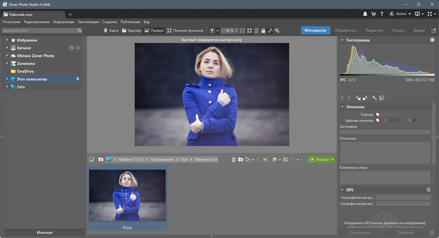 Zoner Photo Studio — это многофункциональный инструмент для обработки, просмотра и управления цифровыми фотографиями. Программа объединяет в себе возможности каталогизации, редактирования и публикации изображений, обеспечивая полный цикл работы с фото на одном устройстве. В ней реализована поддержка RAW-форматов, автоматическое извлечение геоданных и интеграция с картографическими сервисами.