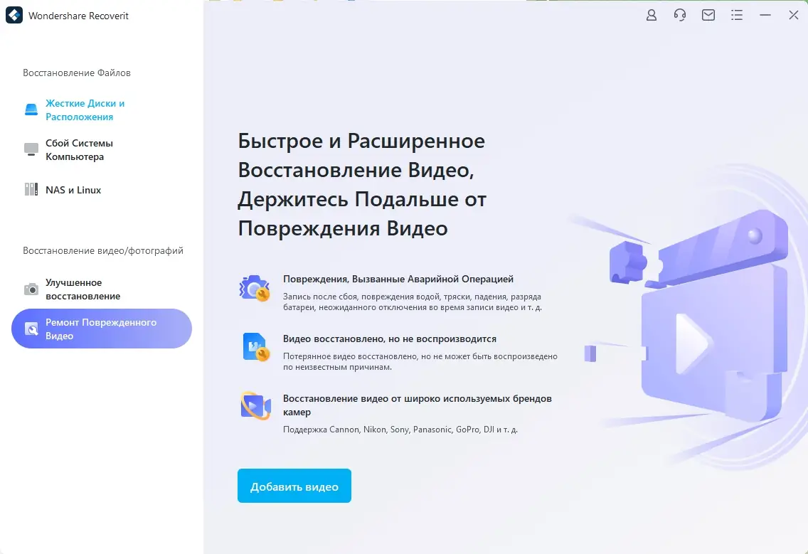 - Функция восстановления повреждённых видеофайлов в форматах MP4, MOV, INSV и FLV.