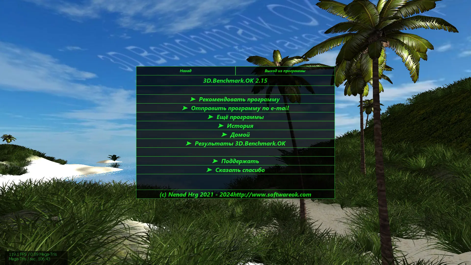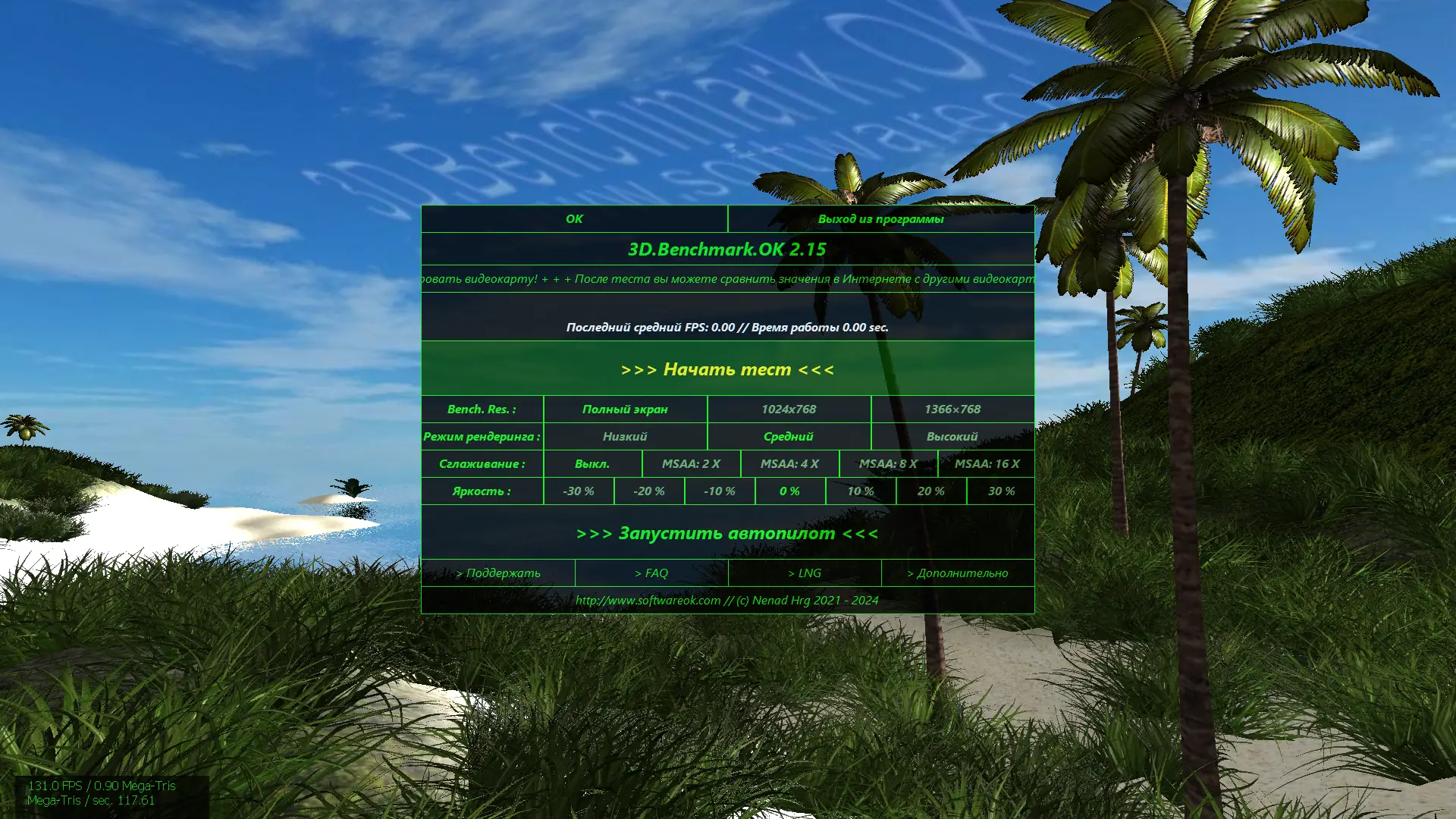 3D.Benchmark.OK разработана для быстрой диагностики графических адаптеров и оценки их реальной производительности в условиях, приближенных к игровым. Утилита нагружает видеокарту сценами, включающими сложные эффекты: динамическое освещение, преломление, отражения, симуляцию воды и ветра. Это позволяет выявить не только уровень FPS, но и возможные визуальные дефекты, которые могут проявляться при интенсивной 3D-нагрузке.