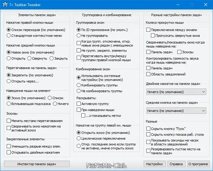 После запуска программа работает в фоне и активируется через системный трей. Основное окно содержит интуитивно понятные переключатели и флажки, сгруппированные по функциональным блокам. Для доступа к расширенным возможностям, таким как ручная настройка групп или изменение поведения системных событий, используется режим эксперта, активируемый через горячие клавиши или контекстное меню. Инспектор задач отображает все активные окна в виде дерева, где можно визуально перетаскивать элементы, изменять их принадлежность и управлять отображением на панели.