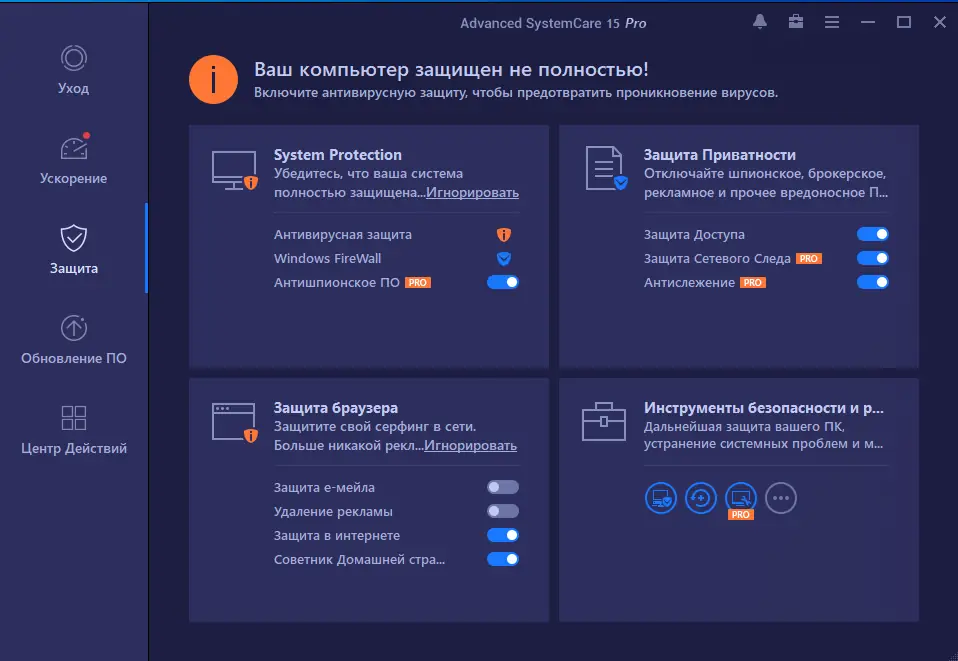 Advanced SystemCare — комплексная утилита для оптимизации и обслуживания операционной системы Windows, объединяющая более 20 инструментов в едином интерфейсе. Программа обеспечивает очистку системы, устранение ошибок реестра, дефрагментацию диска, контроль автозагрузки и защиту от угроз безопасности. Благодаря автоматизированным функциям и глубокому сканированию она помогает вернуть компьютеру высокую производительность и стабильность.