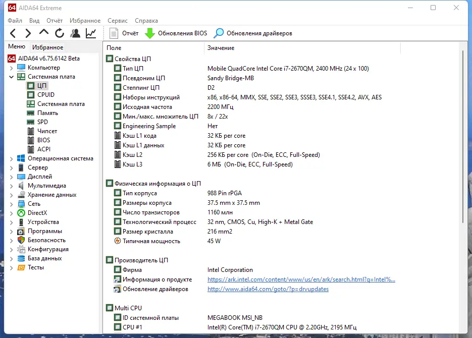 AIDA64 — это профессиональная утилита для диагностики, тестирования и мониторинга аппаратного и программного обеспечения в системах на базе Windows. Программа предоставляет исчерпывающие сведения о компонентах компьютера, включая процессор, материнскую плату, видеокарту, память, диски и периферийные устройства. С её помощью можно провести точную идентификацию оборудования, проверить стабильность системы и оценить производительность отдельных подсистем.