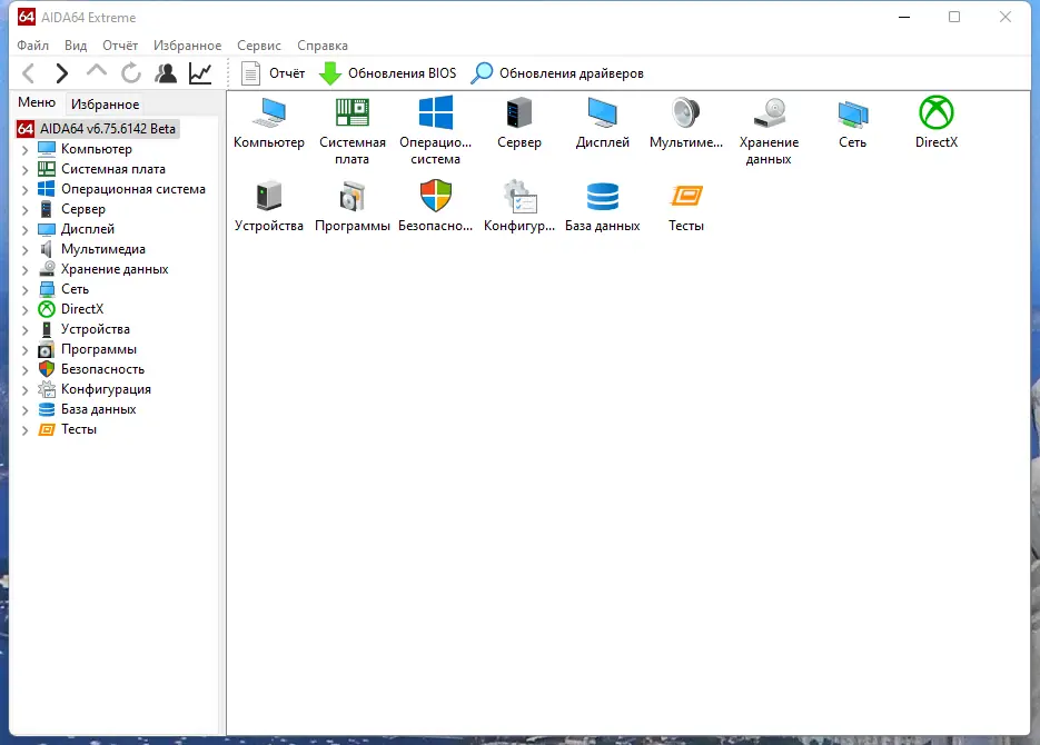 Интерфейс AIDA64 организован в виде древовидного меню, где каждая ветвь соответствует определённому типу компонентов. Пользователь может раскрывать разделы для просмотра детальной информации, например, сведений о BIOS, установленных драйверах или сетевых подключениях. Для запуска тестов производительности доступны отдельные модули, такие как стресс-тест системы, проверка скорости оперативной памяти или оценка пропускной способности дисков.