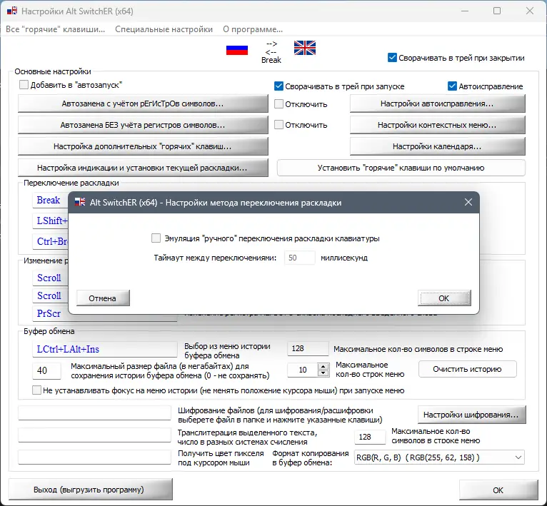 - Гибкие настройки горячих клавиш, включая двойные нажатия и пользовательские иконки для индикации языка.