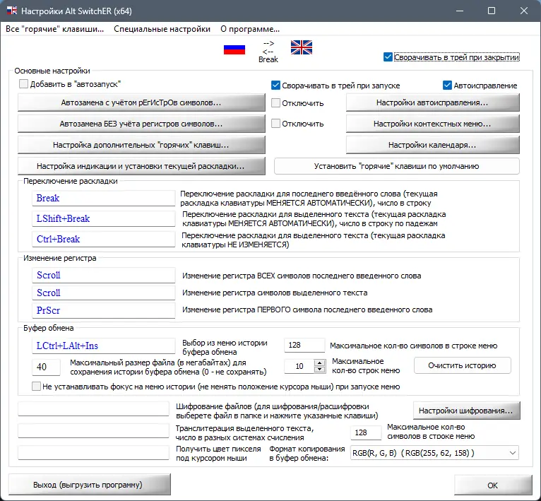 Работа с программой начинается с распаковки архива в удобную директорию и запуска исполняемого файла в зависимости от разрядности системы. После старта приложение размещает иконку в системном трее, отображая текущую раскладку в виде флага. Все настройки осуществляются через контекстное меню, вызываемое кликом по иконке, где доступны разделы: горячие клавиши, автозамена, форматы дат, цветовые параметры и другие функции. Пользователь может настроить двойное нажатие пробела для вставки знаков препинания, назначить сочетания клавиш для запуска приложений или вставки шаблонов текста.