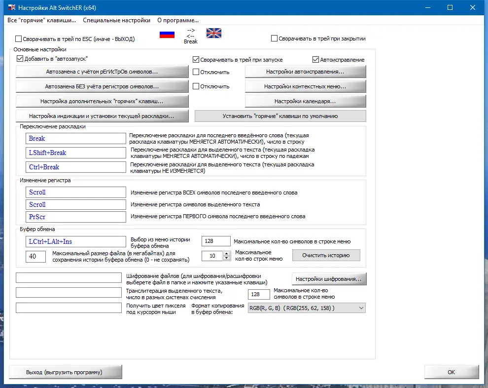 Для начала работы достаточно распаковать архив и запустить исполняемый файл, соответствующий разрядности системы. После запуска в системном трее появляется иконка, отображающая текущую раскладку. Все настройки осуществляются через контекстное меню программы, доступное по щелчку правой кнопкой мыши. Пользователь может настроить горячие клавиши для переключения языков, включения и отключения автоисправления, а также задать исключения для определённых приложений. В разделе настроек доступно редактирование словарей, управление буфером обмена и настройка дополнительных функций, таких как автозамена сокращений и запуск браузера с выделенным текстом. Для шифрования файлов используется встроенный модуль, интегрированный через библиотеку Crypto++. Утилита также позволяет назначать макросы и передавать выделенные данные в URL или параметры программ, что расширяет её функциональность в повседневной работе. В составе поставки присутствует подробное руководство, в котором описаны все режимы и комбинации клавиш.