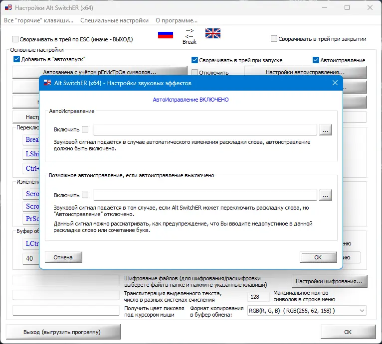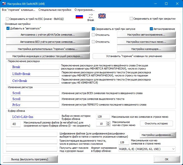 Для начала работы необходимо распаковать архив и запустить соответствующий исполняемый файл в зависимости от разрядности системы. После запуска в системном трее появляется иконка-флаг, отображающая текущую раскладку. Все настройки осуществляются через контекстное меню программы, доступное по клику правой кнопкой мыши на иконке. Пользователь может добавлять собственные сокращения, настраивать формат дат, управлять поведением пробела и задавать макросы для URL-запросов. Например, можно настроить передачу выделенного текста в поисковую строку или переводчик, используя шаблон с параметром []. Также доступна возможность шифрования файлов и настройки цветовых форматов копирования. Подробное руководство инструкция по настройке встроено в интерфейс и доступно в виде подсказок и описаний в каждом разделе.