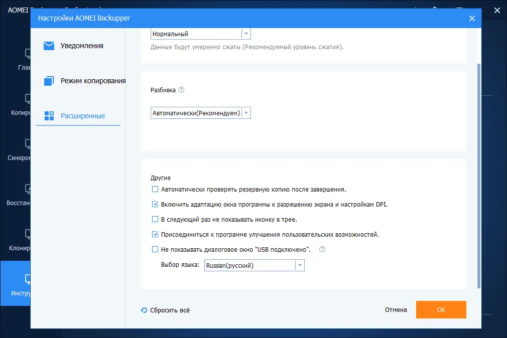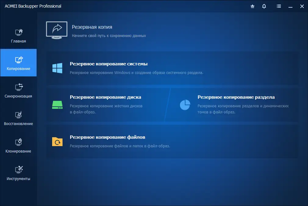 - Поддержка резервного копирования системы, дисков, разделов и отдельных файлов