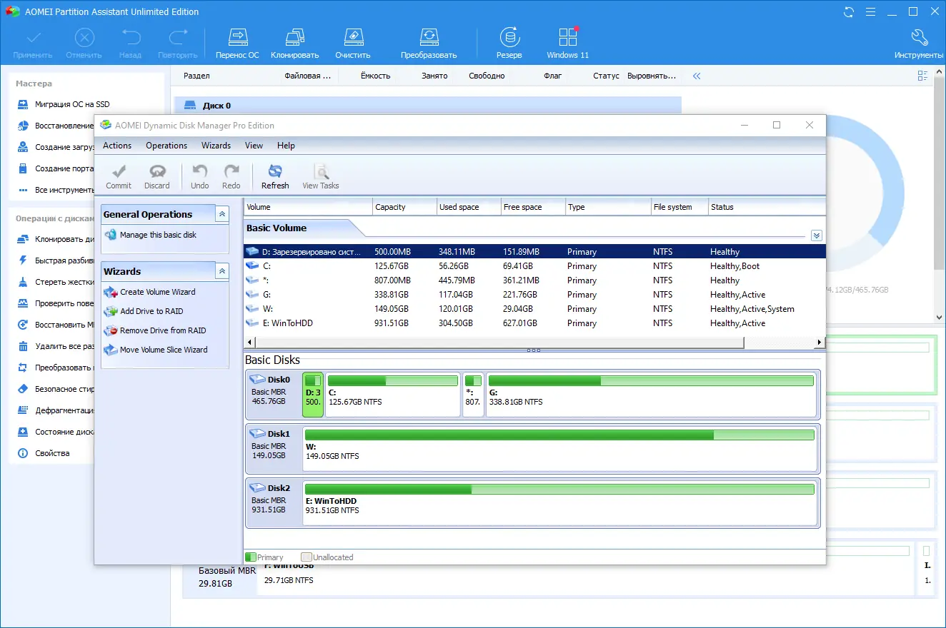 - Поддержка управления динамическими дисками через встроенный AOMEI Dynamic Disk Manager Pro