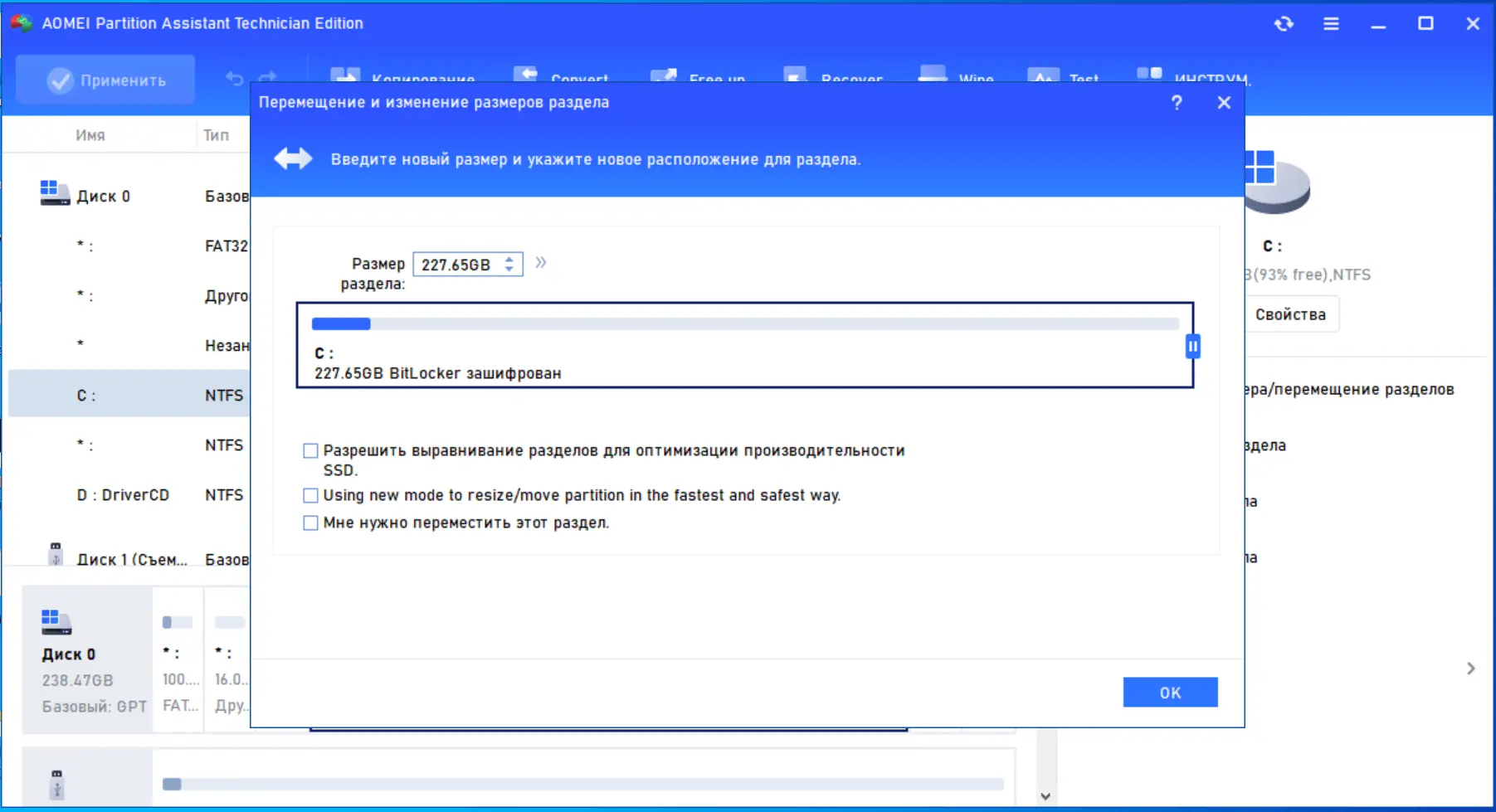 Интерфейс программы интуитивно понятен и построен по принципу мастера действий, что упрощает выполнение даже сложных операций. Для изменения размера раздела достаточно выбрать его на схеме диска, указать новые границы и подтвердить операцию, после чего изменения применяются в фоновом режиме. При миграции системы на SSD используется специальный мастер, который автоматически переносит все необходимые данные, включая загрузчик. Создание загрузочного USB-носителя возможно через встроенный инструмент, который генерирует среду WinPE для работы вне операционной системы.