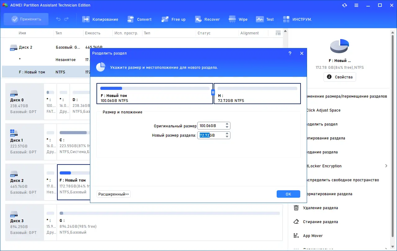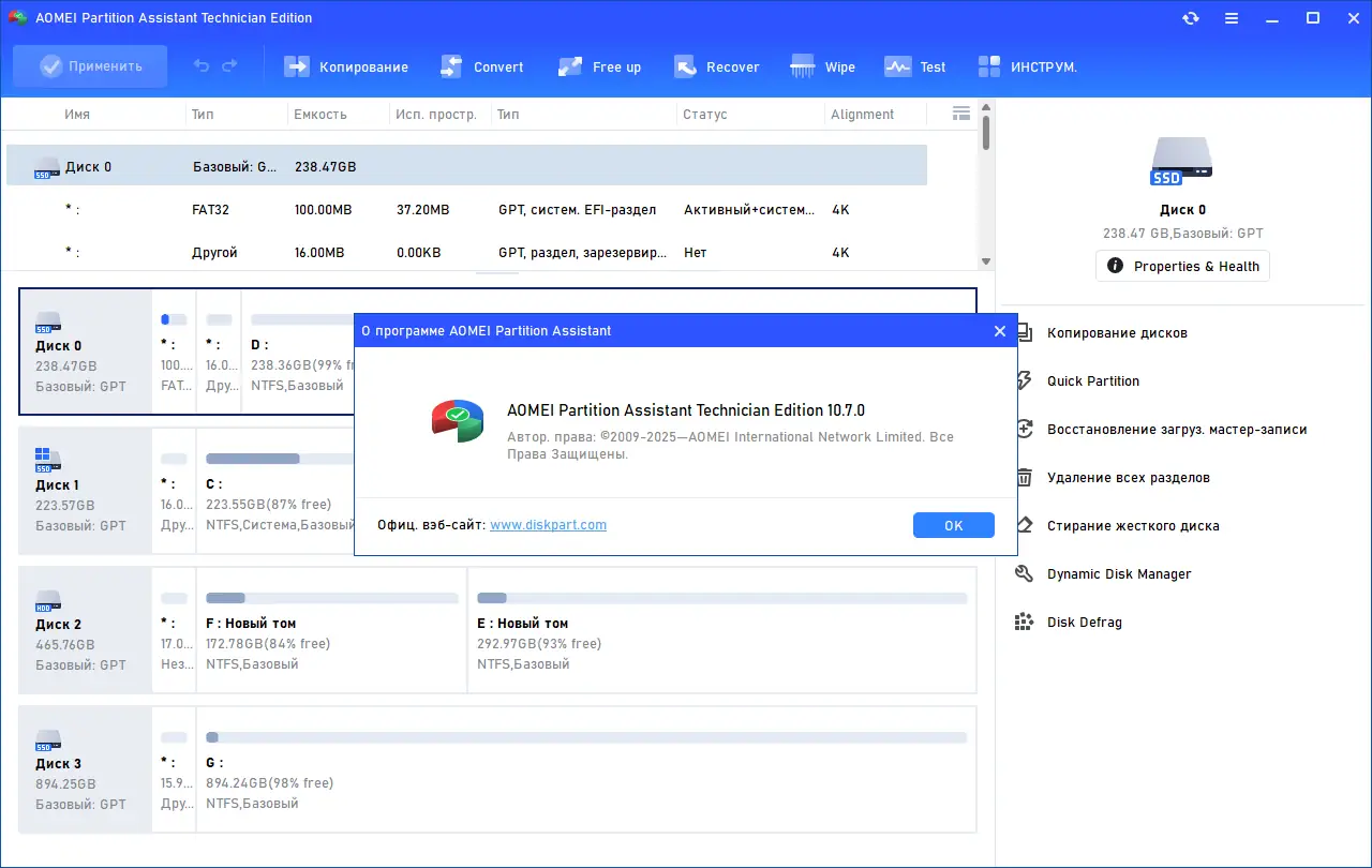 Программа AOMEI Partition Assistant предназначена для эффективного управления жёсткими дисками и разделами на компьютере. Она позволяет изменять размеры, объединять, клонировать и восстанавливать разделы без потери данных. Инструмент поддерживает как традиционные HDD, так и современные SSD, обеспечивая стабильность и производительность системы.