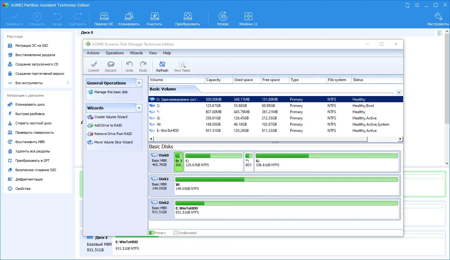 - Поддержка управления динамическими дисками через встроенный AOMEI Dynamic Disk Manager Pro