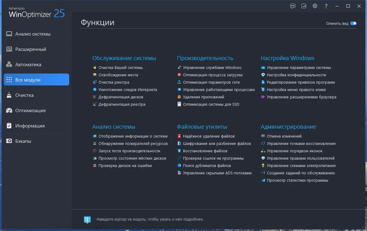 Ashampoo WinOptimizer — это комплексный инструмент для глубокой оптимизации операционной системы Windows, обеспечивающий высокую производительность, стабильность и безопасность. Программа проводит тщательную очистку реестра и дисков, настраивает автозагрузку, ускоряет интернет-соединение и защищает личные данные. Её модули адаптированы под современные версии Windows, включая 11, и позволяют достичь максимальной эффективности с минимальными усилиями.