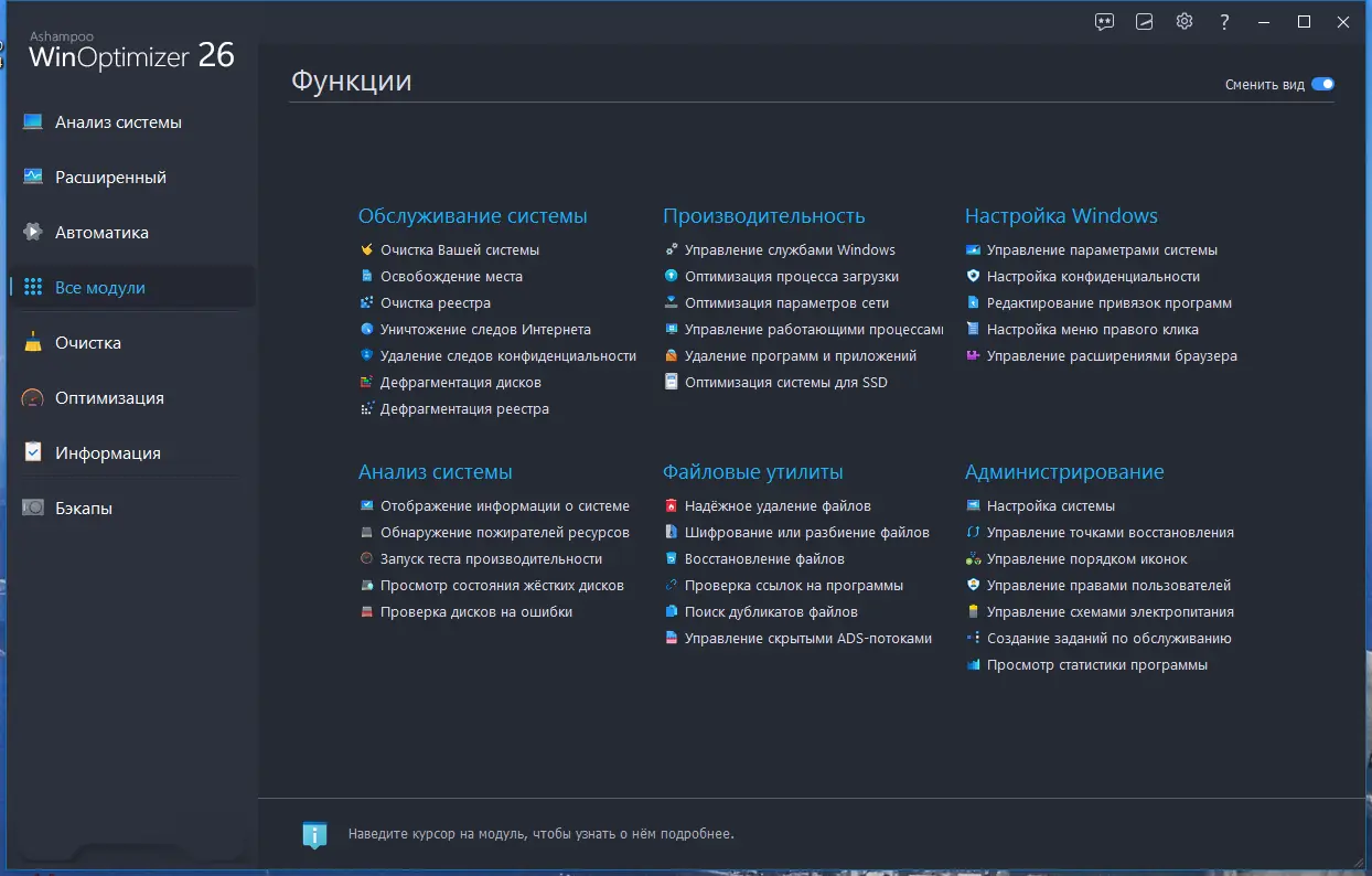 Ashampoo WinOptimizer — это комплексный инструмент для тонкой настройки, очистки и повышения производительности операционной системы Windows. Программа объединяет десятки утилит, направленных на ускорение работы ПК, безопасное удаление данных, шифрование файлов и оптимизацию системных параметров. С её помощью можно быстро устранить накопленный цифровой мусор, настроить автозагрузку, улучшить работу интернет-соединения и продлить срок службы SSD-накопителей.