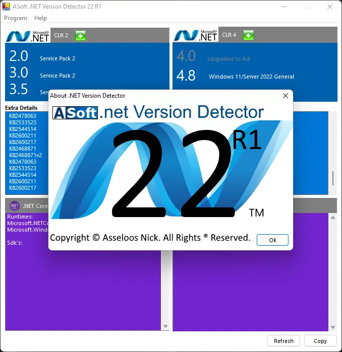 ASoft.NET Detector — это компактная утилита для определения установленных на компьютере версий .NET Framework и .NET Core. Программа отображает доступные и отсутствующие компоненты, позволяет перейти к загрузке недостающих модулей и просматривать пути установки. Инструмент независим от .NET и работает даже при полном отсутствии среды.