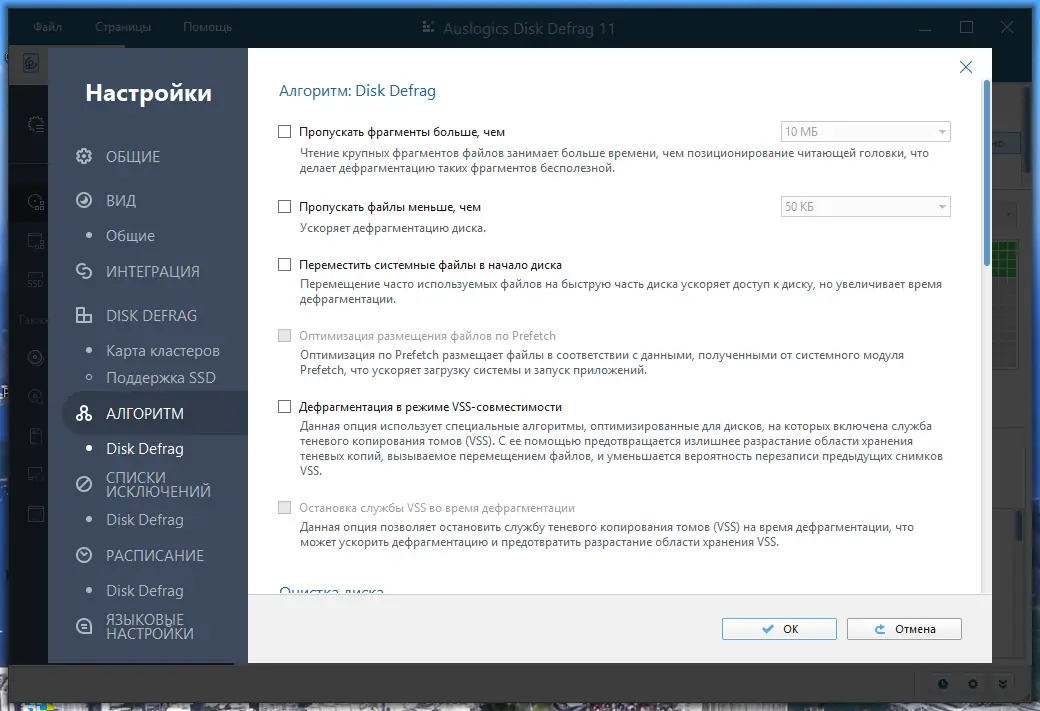 - Поддержка различных режимов дефрагментации, включая оптимизацию для SSD