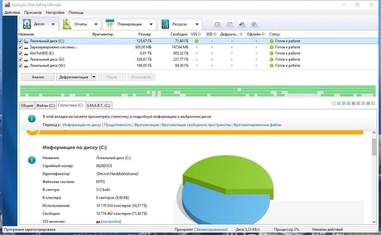 Интерфейс программы интуитивно понятен и не требует глубоких технических знаний. После запуска можно сразу начать анализ диска, чтобы оценить степень фрагментации. По завершении анализа доступна дефрагментация с выбором одного из нескольких режимов оптимизации — стандартного, полного, быстрого или интеллектуального. Программа позволяет настроить автоматическое выполнение задач в фоновом режиме по расписанию, что особенно удобно для поддержания постоянной производительности. Также доступна возможность дефрагментации отдельных файлов или папок.