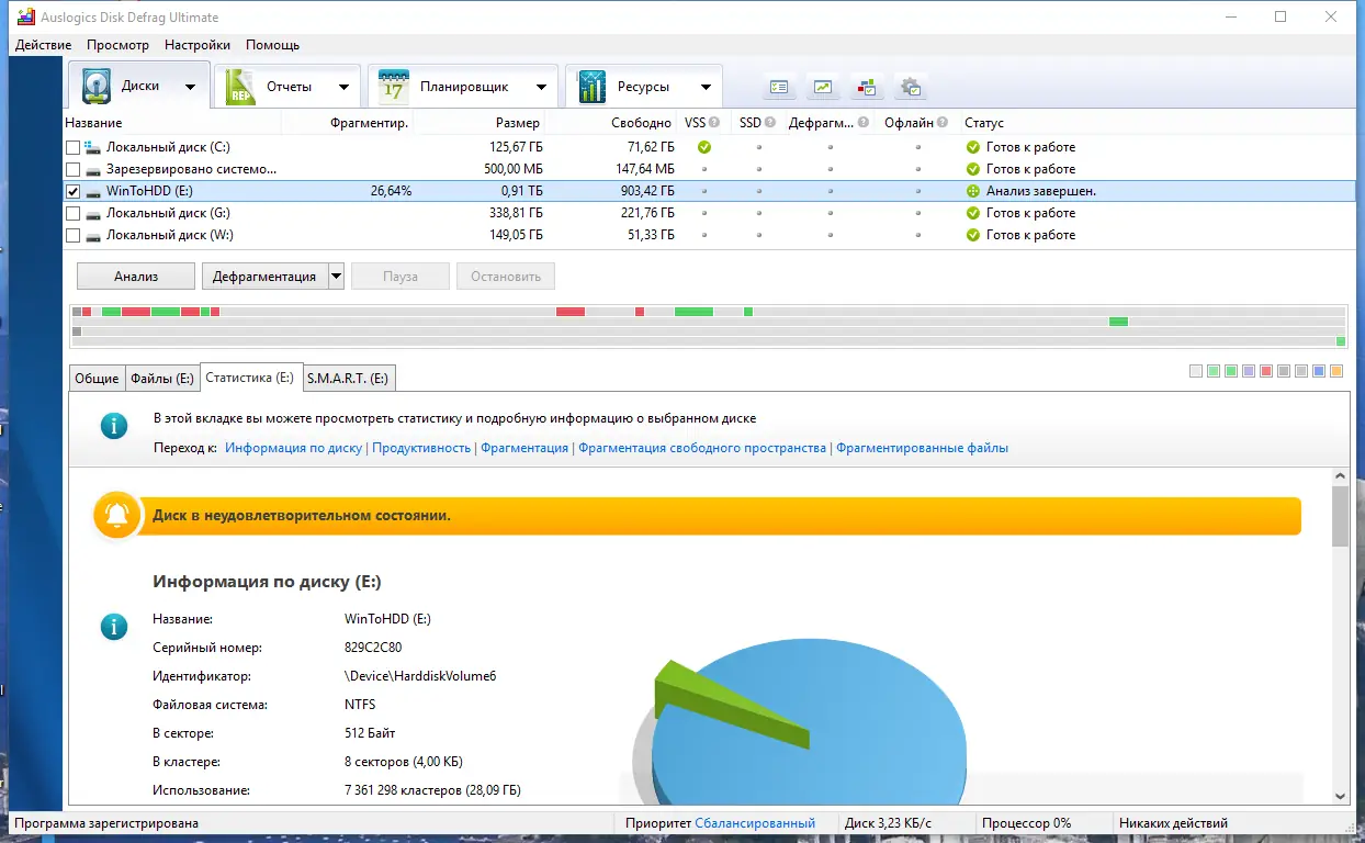 - Функция мониторинга производительности диска помогает отслеживать изменения скорости и определять момент, когда требуется дефрагментация