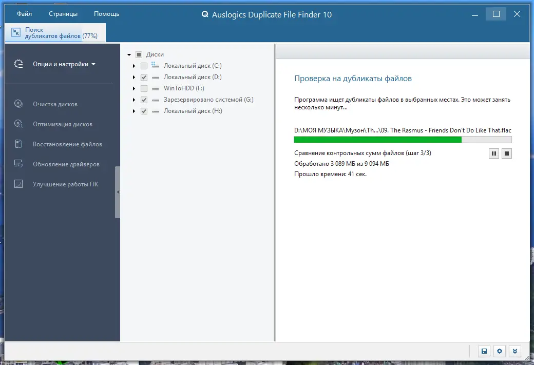 Auslogics Duplicate File Finder сочетает в себе производительность, точность и простоту интерфейса. Она помогает поддерживать порядок в файлах, особенно на устройствах с ограниченным объёмом памяти. Благодаря оптимизированному алгоритму поиска, процесс сканирования проходит быстро, даже при большом количестве данных. Программа не потребляет много ресурсов и может работать в фоновом режиме.