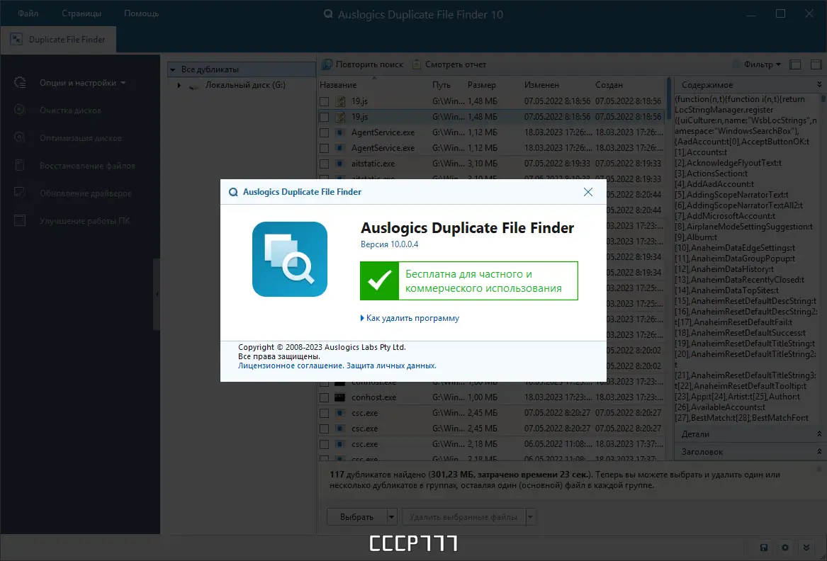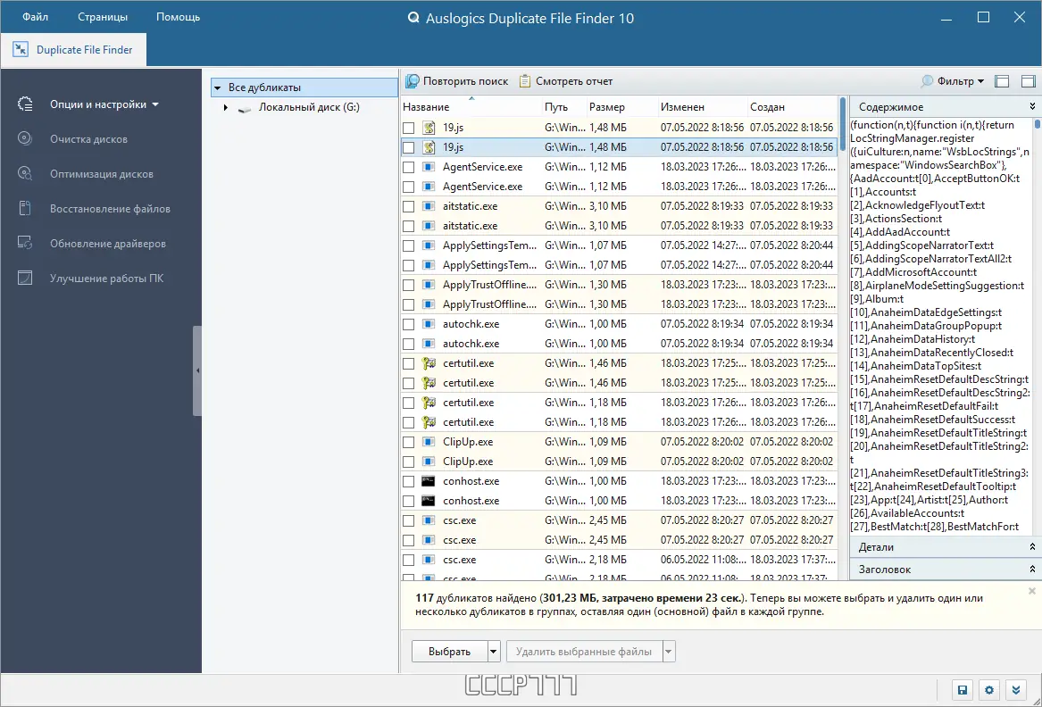 - Выявляет повторяющиеся файлы любого формата, включая документы, архивы, музыку и видео