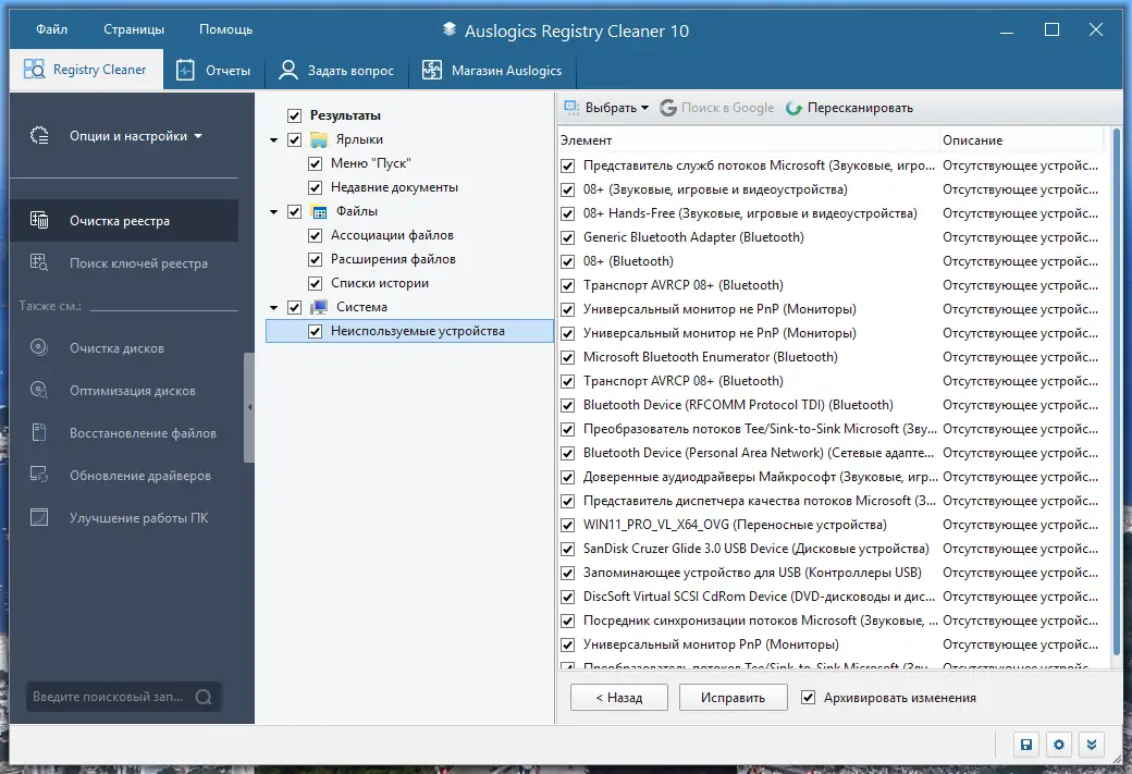 - Автоматическое сканирование всех веток реестра на наличие ошибок и устаревших записей