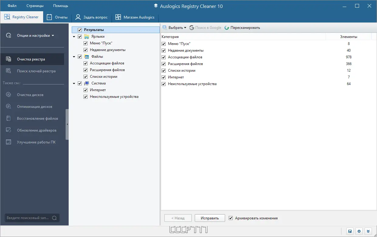 - Программа эффективно находит и устраняет повреждённые ссылки, остатки удалённых программ и неверные пути к файлам.