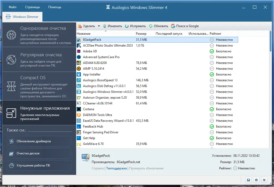 - Требует осторожности при выборе компонентов для удаления, чтобы не нарушить работу системы